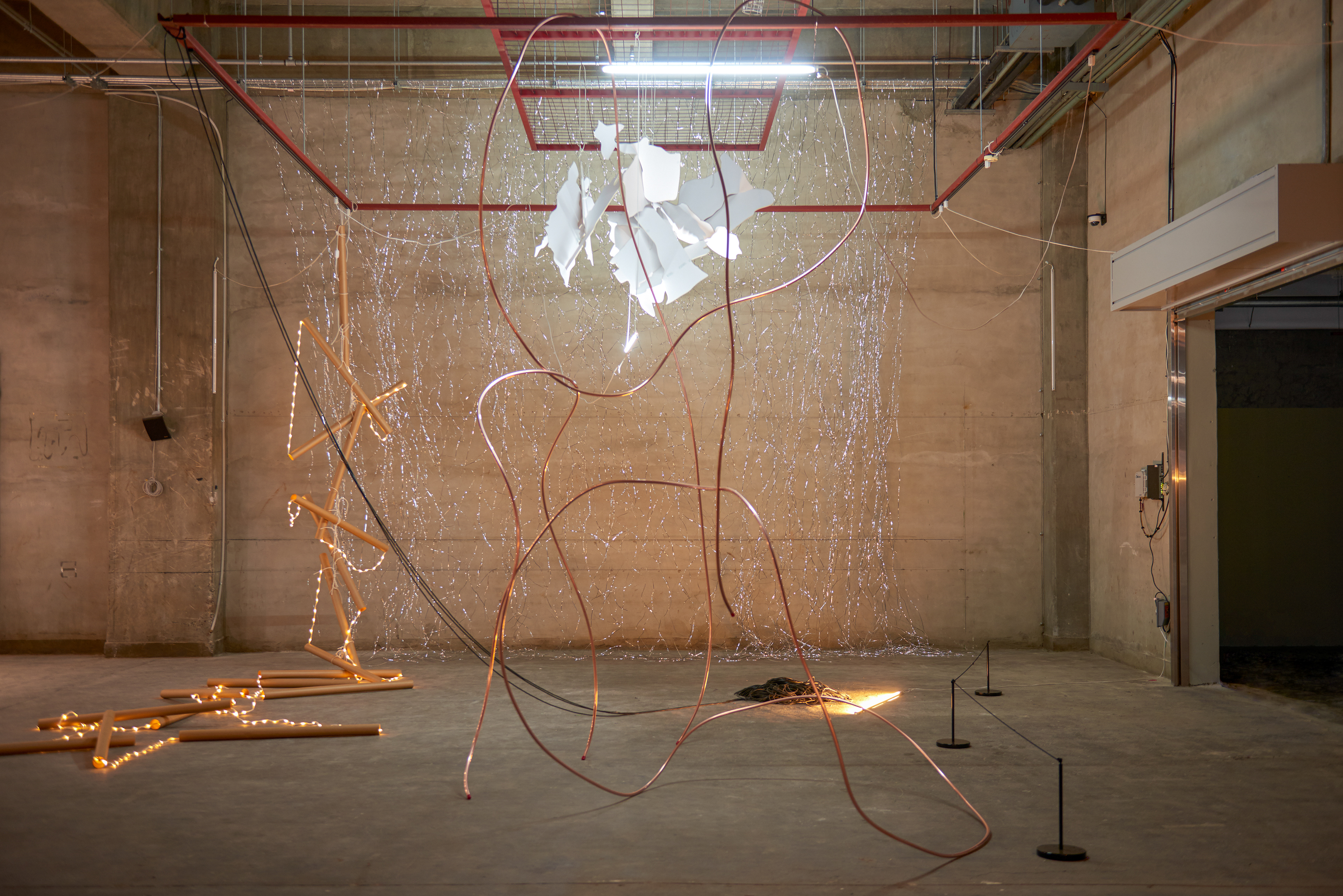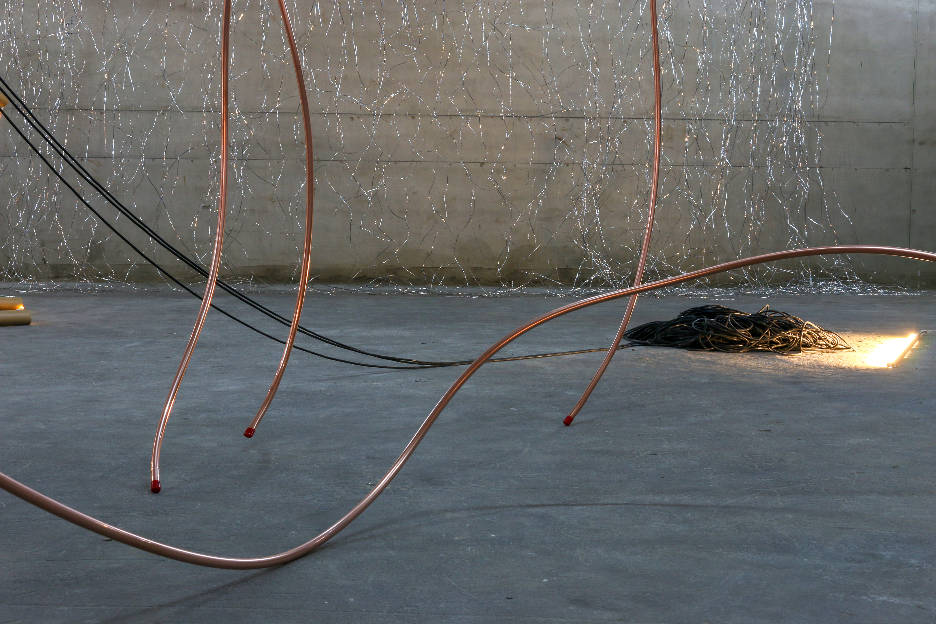 This chandelier is hanging parasitic over the existing ceiling structure. It adapts to the situation, but resists flexible mobility. Once the exhibition is over it will sacrifice itself for the sake of uniqueness.