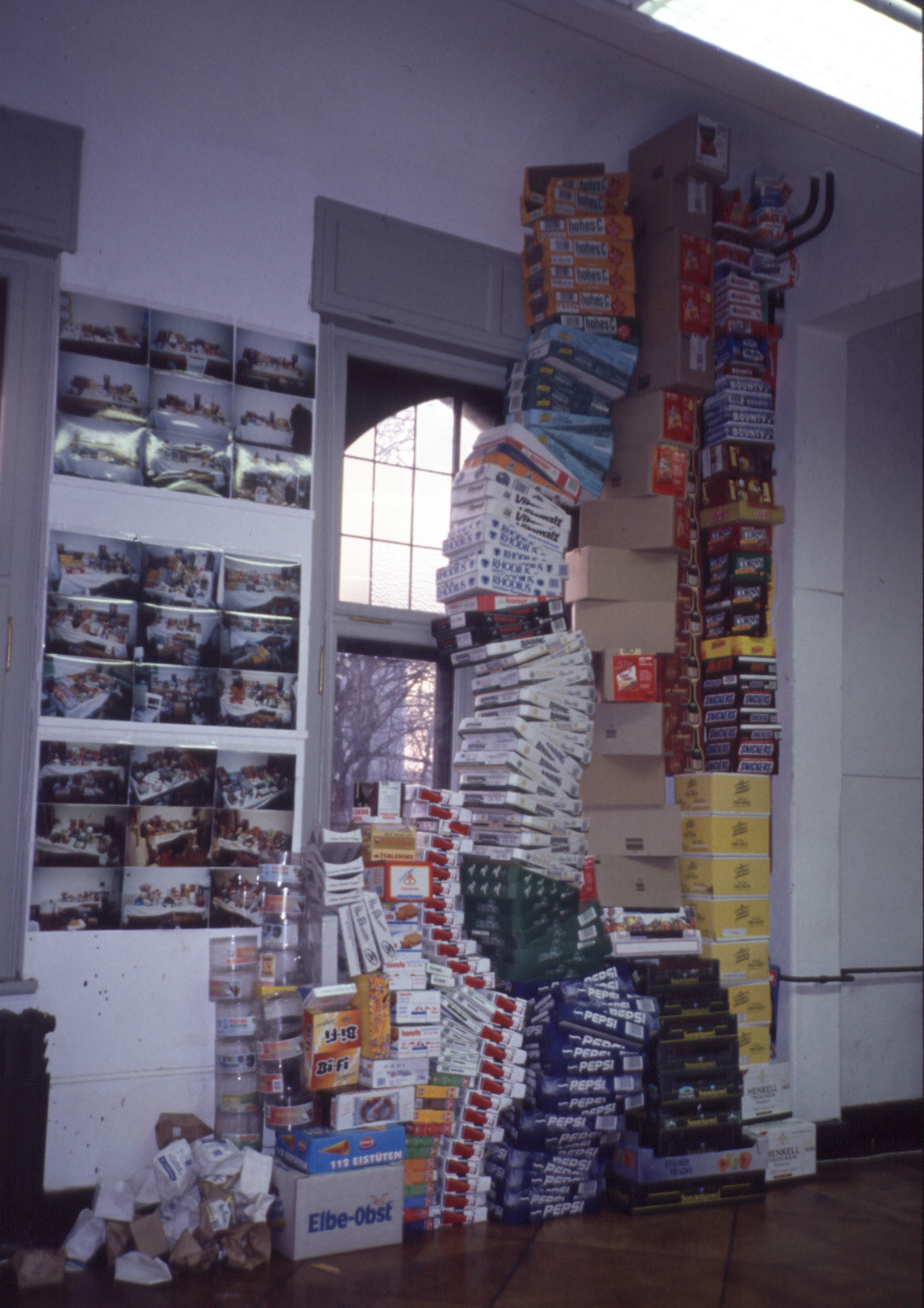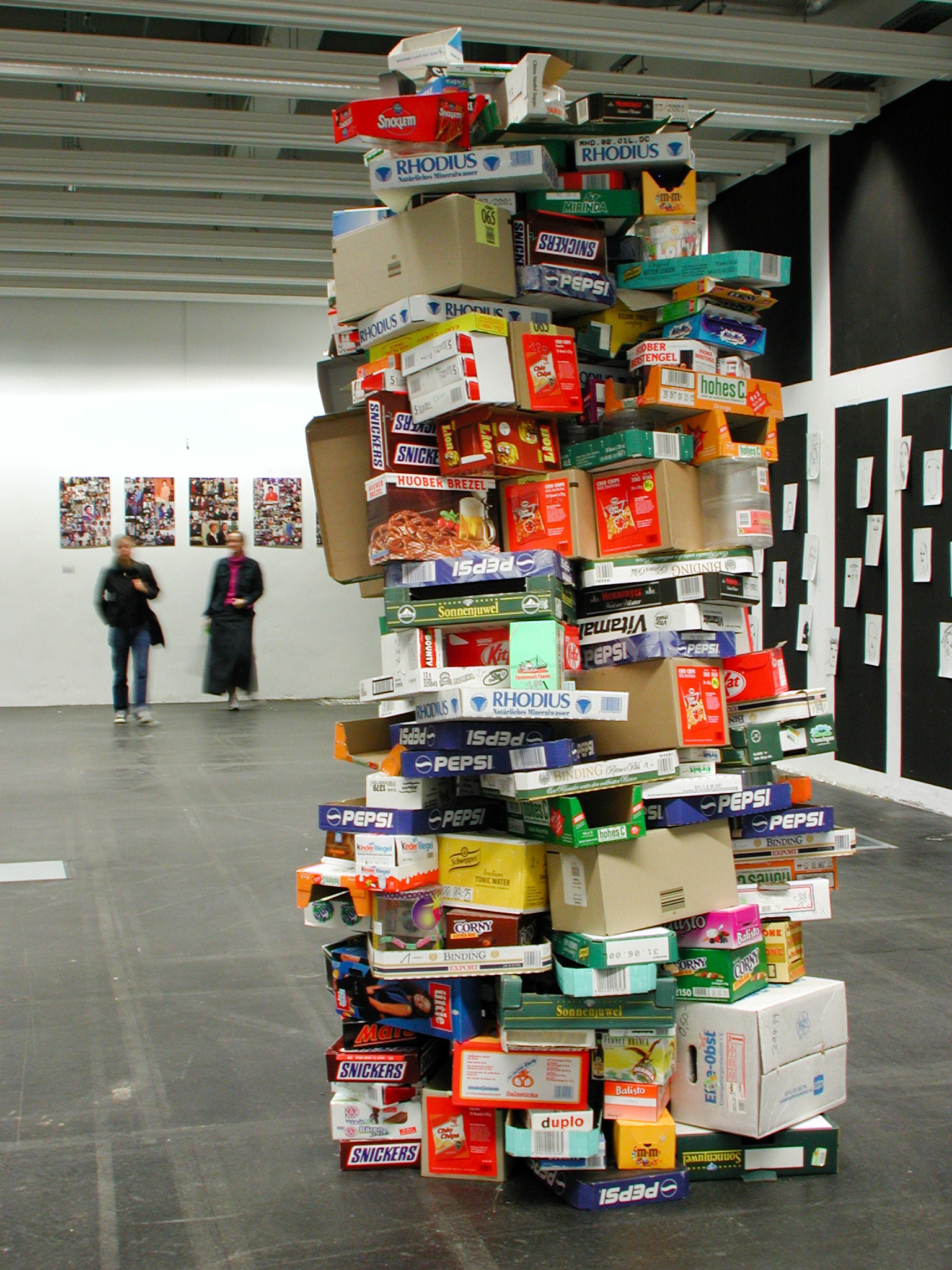 Pop Up Sculptures is a series of installations with empty cardboard boxes from mykiosk project. The boxes were stacked without any glue or other supporting material. They easily collapsed. I reused the boxes for several installations that all appear vertical and monumental, but are actually weak.