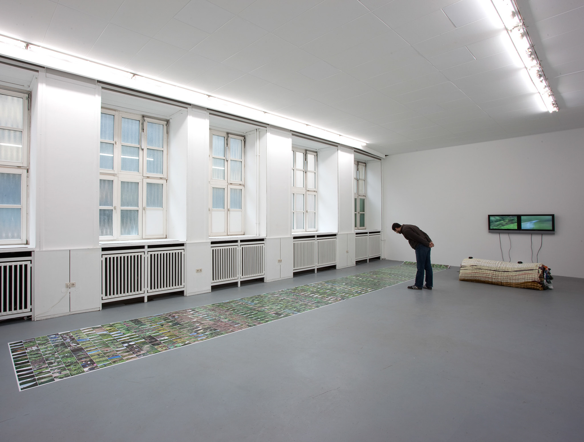 The set up of the installation was inspired by traditional oriental landscape paintings on paper rolls. Often you can find comments or critiques by the viewers of the painting as notes directly on the painting or even in the landscape. It was fascinating for me that the discourse about the art work became physically a part of the work. Sometimes this kind of discourse continued for decades and centuries. Different forms of representation of myforestfarm are juxtaposed in the installation: text and photographic images as well as speech and video images. On the wall hangs a text about myforestfarm by a Korean art critic in Hangeul, which was produced in the style of a photography. In front of that lies a 30 meter paper role with the photo archive from myforestfarm. In the two synchronized videos our agriculture consultant Gabby Mondragon walks through the farm and explains the various plantings.