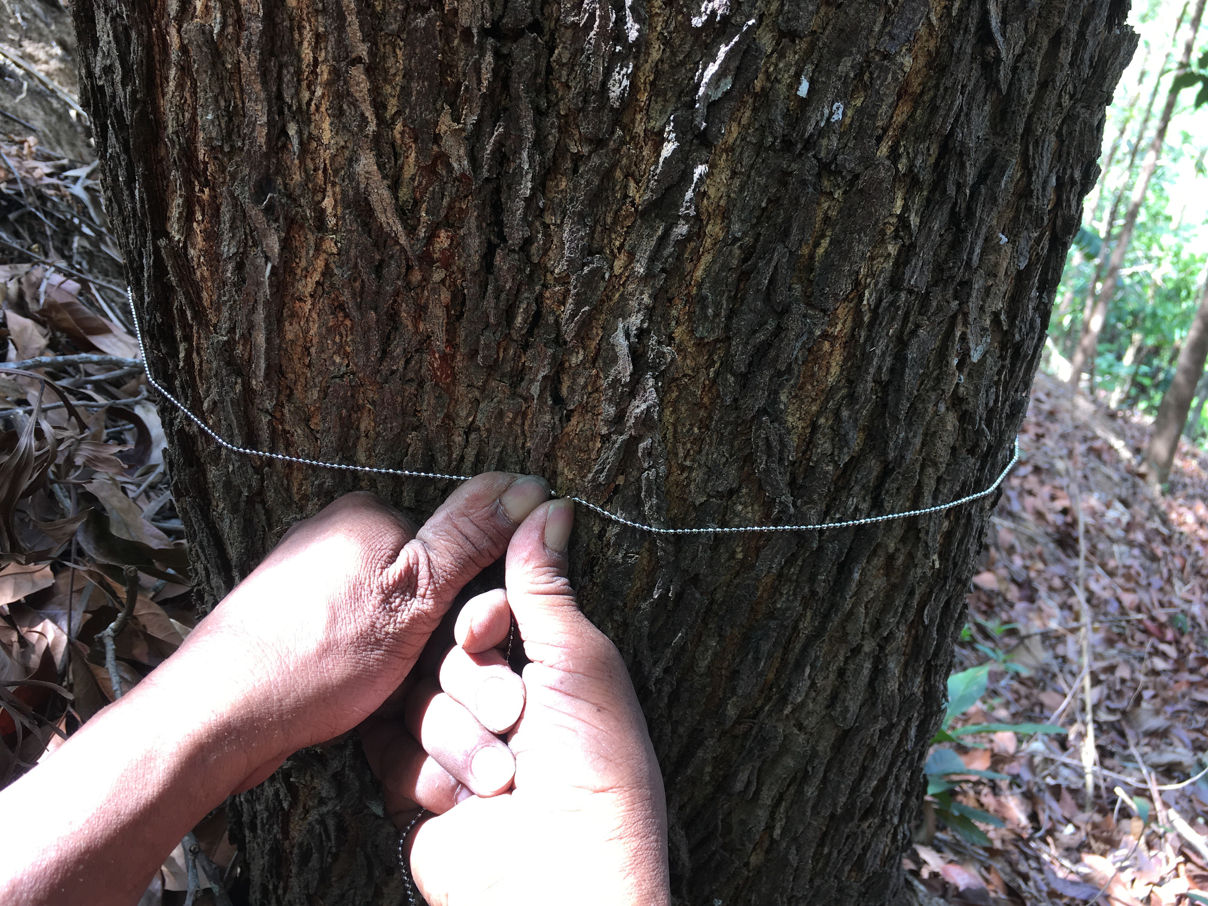 A photogram is a photographic image made without a camera by placing objects directly onto the surface of a photographic paper. Areas of the paper that have received no light appear white; those exposed to light appear black. The photogram captures the actual size of the necklace as it was tied around the actual tree that it measured. The photogram is presented in a horizontal way as if it shows the cut through the tree trunk. This particular photogram represents the Mango - 02 tree from myforestfarm. It is a prototype and potentially there could be created a photogram for each of the more than 1500 necklaces / trees of myforestfarm.