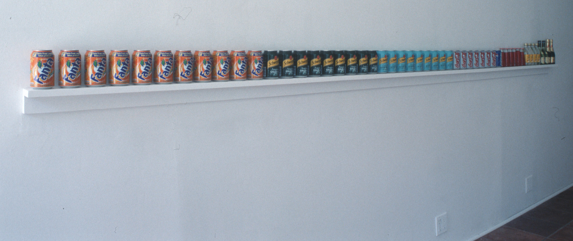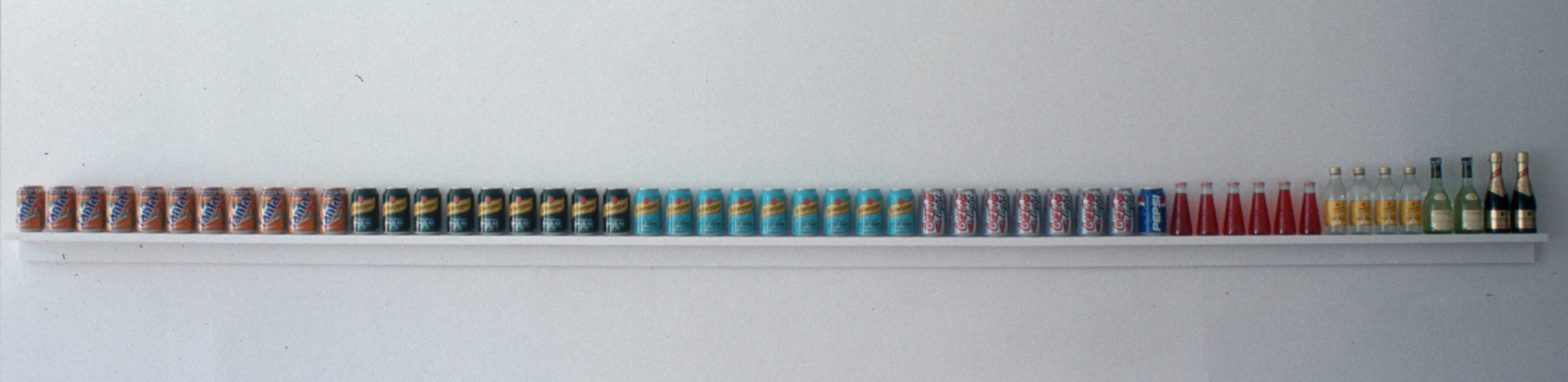 The project mykiosk stopped when I graduated and left my studio in the Staedelschule in 2002. At the end there were 51 items not sold. At the same time the final calculation showed that 1316,31 Euro were missing in the surplus, because over the years several people did not pay and items got lost or spoilt. In the installation Missing Money theses 51 items were strung together. The eat-by date was then expired, so they lost their use-value. I decided to sign each item and declare them as art objects. The items were then offered for 25,81 Euro each. If they were all sold they would compensate for the missing money (25,81 Euro x 51 = 1316,31 Euro). This relation ship is nonsensical and is used as an absurd pretext to define an arbitrary price for these objects as they were transformed into art.