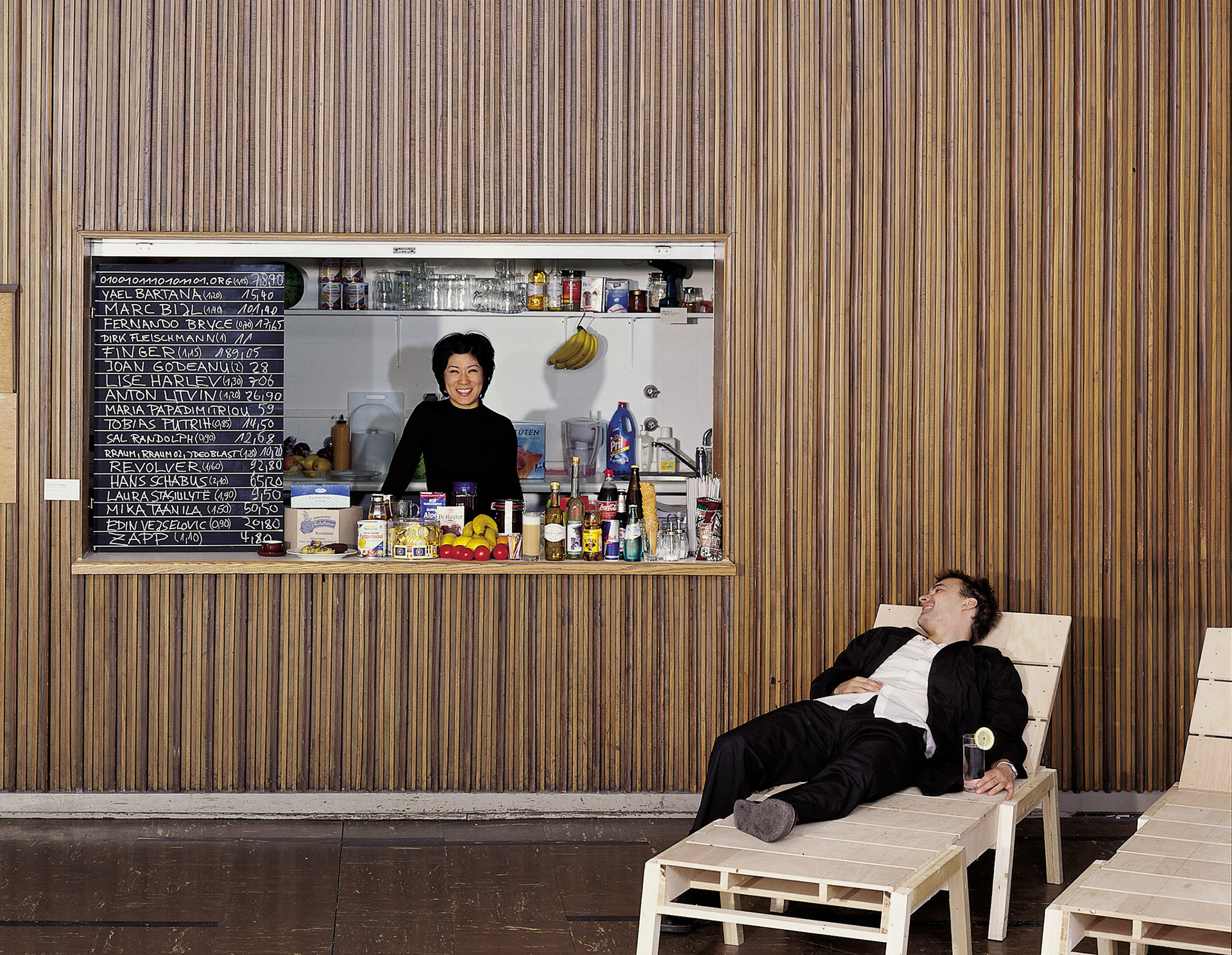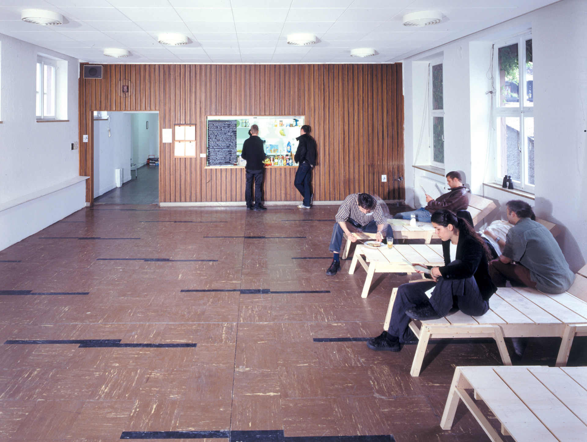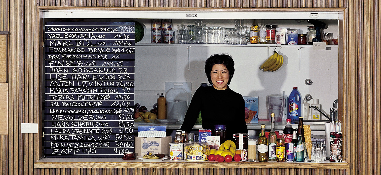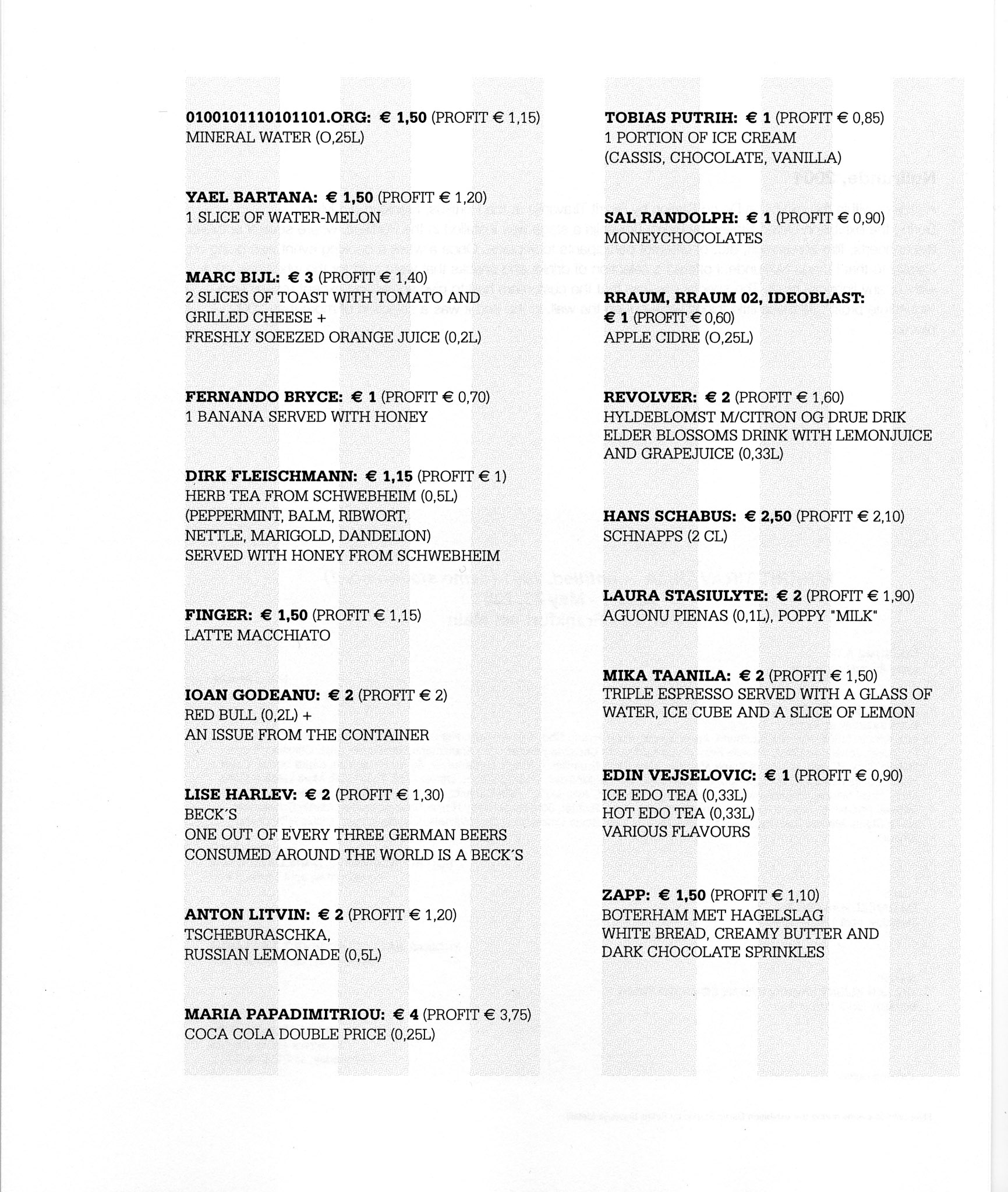 I operated a Bistro at Manifesta 4 for visitors to consume snacks and refreshments and relax. The compilation of the menu and the prices were decided by the artists who exhibited at Manifesta 4 and who were scheduled to receive a fee of 250 Euro. I asked them to propose a product that would be sold under their name. The artists were asked to waive their honorarium of 250 Euro if they wanted to participate in mybistro. In exchange they would receive the profit from the sale of their products. The current count was shown on a blackboard.