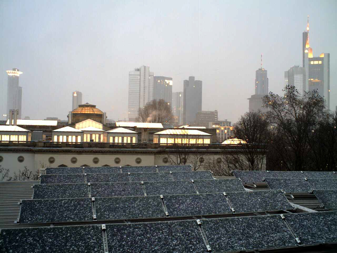 myempire is a non-stop, live video internet stream, which shows my mysolarpowerplant on the roof of the Staedelschule art academy in Frankfurt. The projection covers the complete wall and gives the illusion to offer a direct view to the city. The titel links to the Empire film by Andy Warhol and refers to the notion of the term „Empire“ as in the book with the same name by Michael Hardt and Antonio Negri from 2000.
