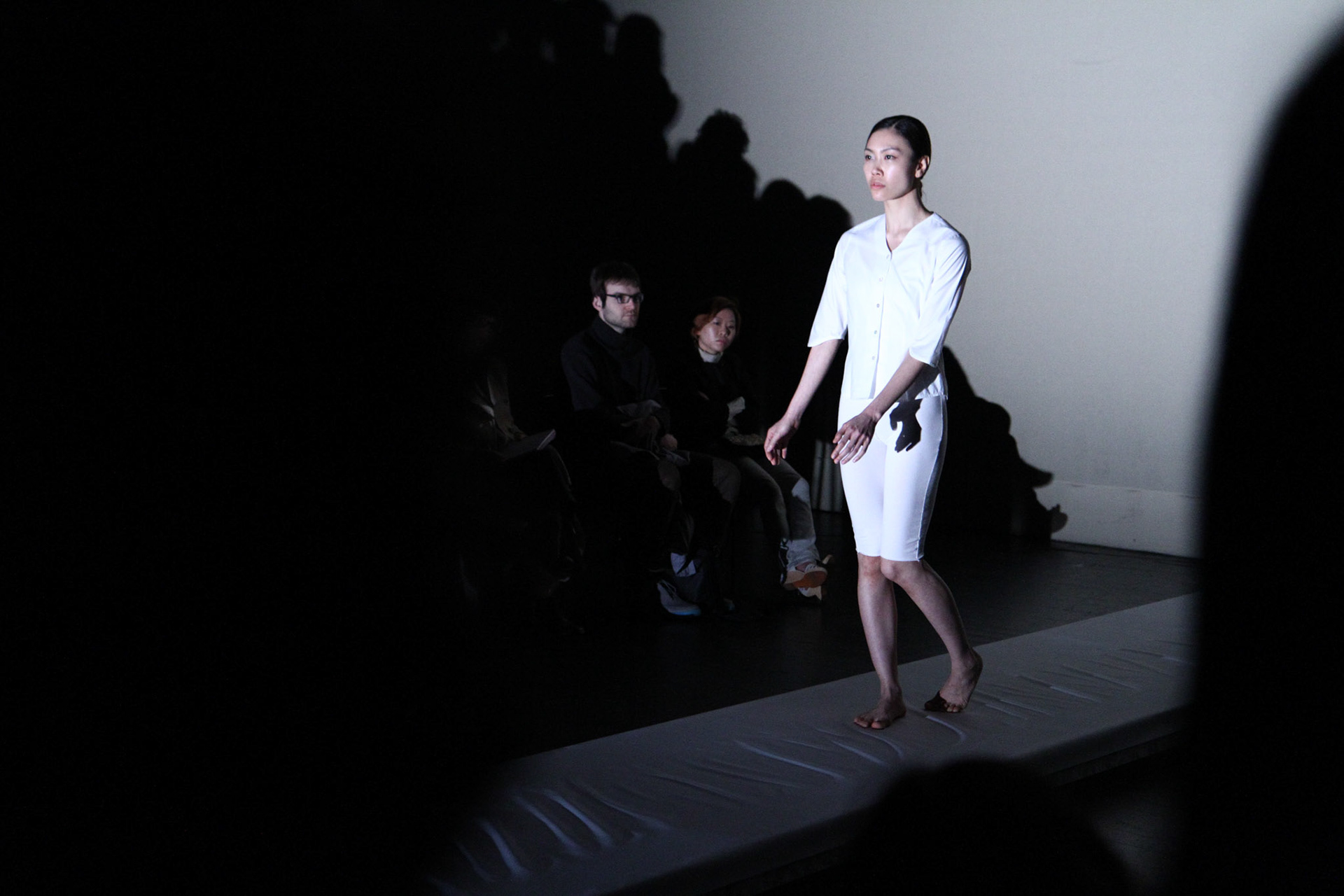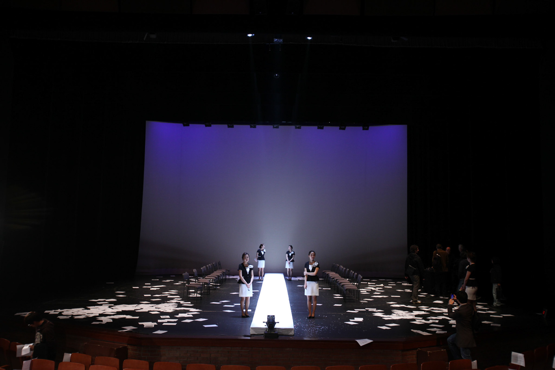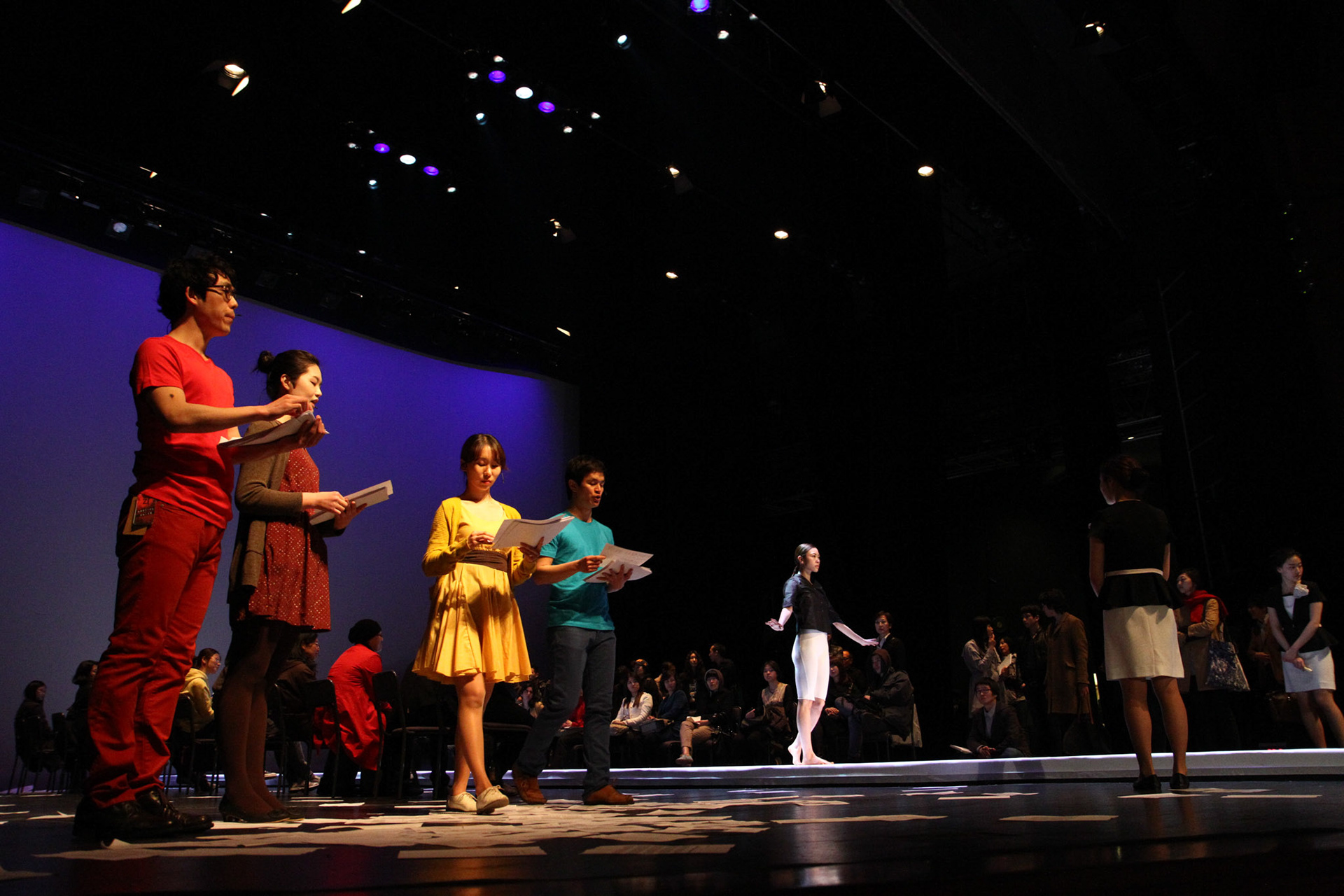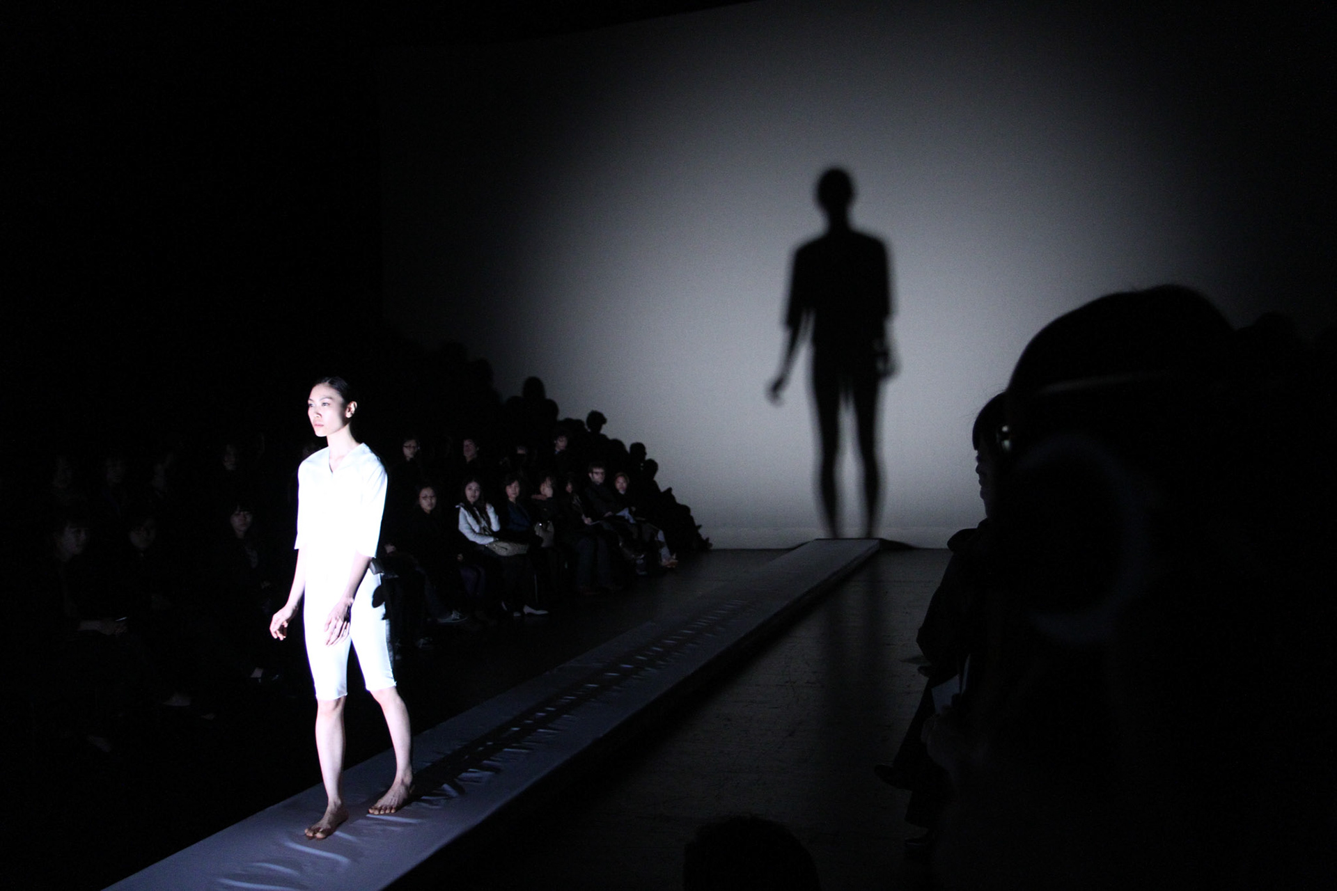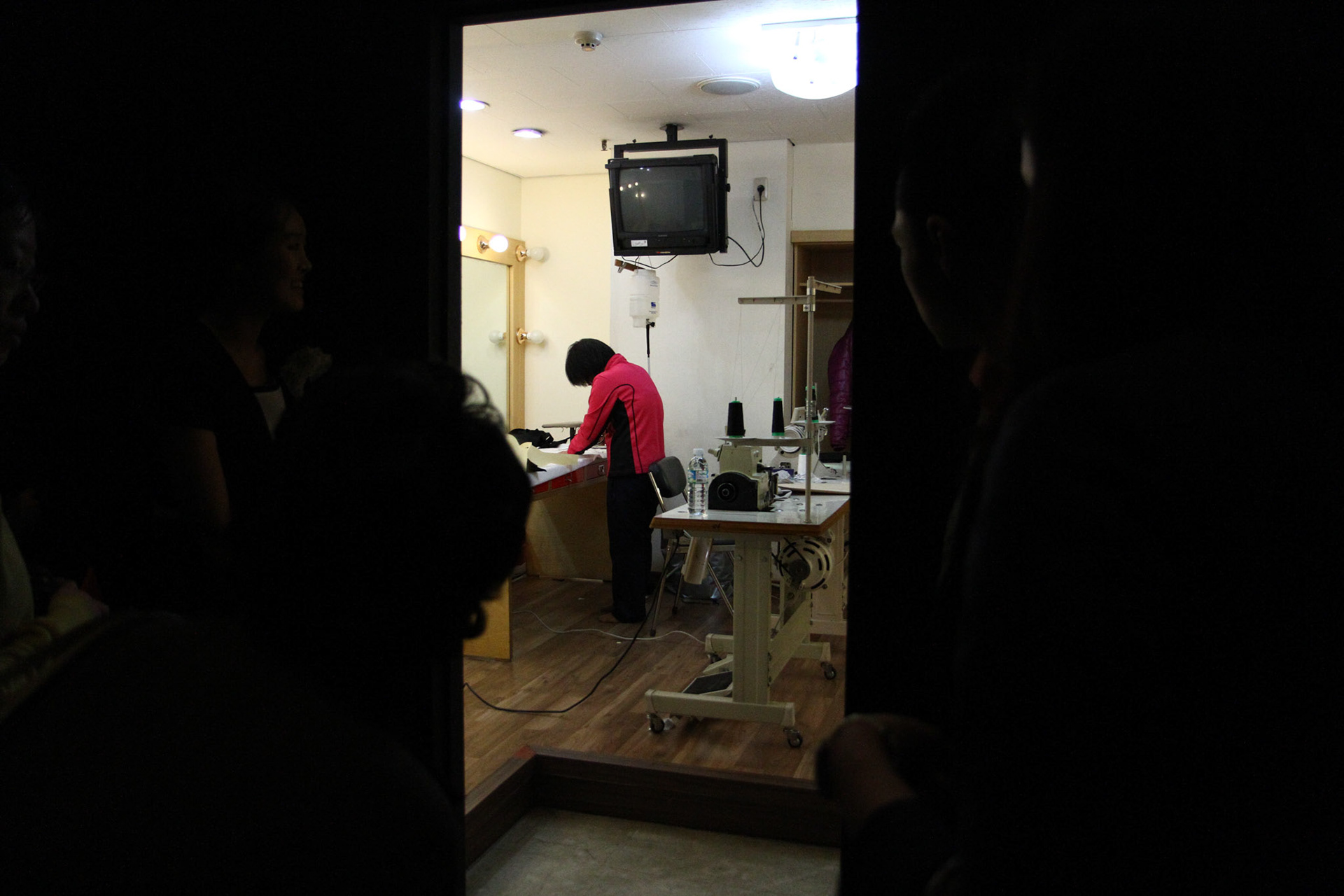 “With his new work entitled myfashionshow, Fleischmann steps literally into unchartered territory with his art. His exploration of North Korea´s special economic zone is transformed into an immersive theater environment that leads the spectator on an imaginary business trip from South to North Korea. Moving from the lobby, across the theater and backstage, becomes a metaphorical journey through the borderlines, production conditions, business privileges, educational purposes and media rhetoric around the Kaesong Industrial Complex. The activities are centered around the catwalk, which divides the stage into two parts. The models move in slow motion as a counter statement against the speed of the fashion industry, while master of ceremonies Young June Lee guides spectator-protagonists through the evening, performing live critique in the style of a Brechtian moderator. Fleischmann is launching the format of a fashion show towards a paradigm shift in our perception of commodities. His contextual approach makes the oft-obscured relationship between labour and commodity the subject matter in myfashionshow. While the myfashionshow trip is imaginary, the protagonists are authentic. The owner of the factory, where the garments were produced, grants the spectators an audience while the seamstress is re-enacting the sewing of the original sample shirts in real time.” (from the press release)