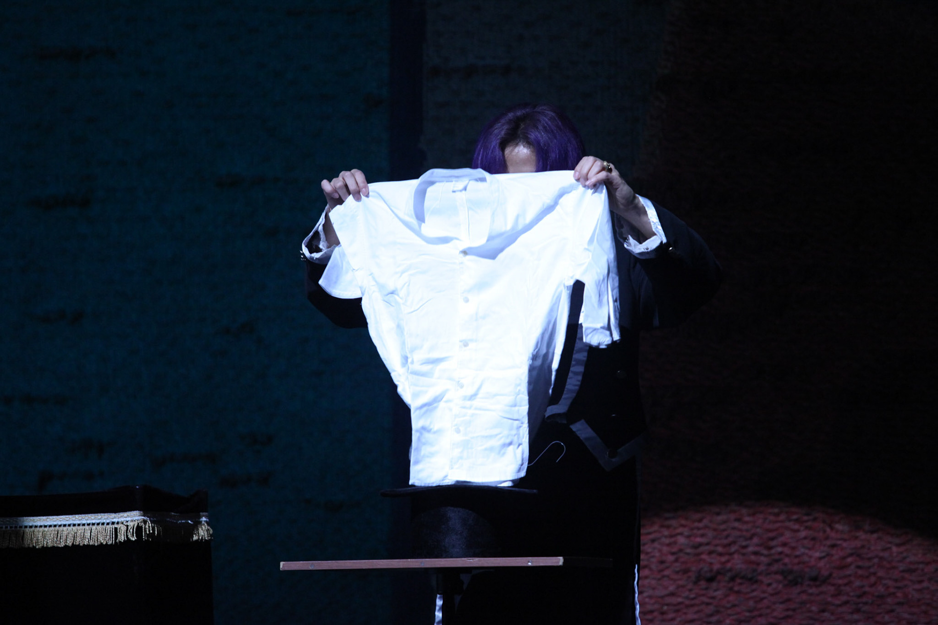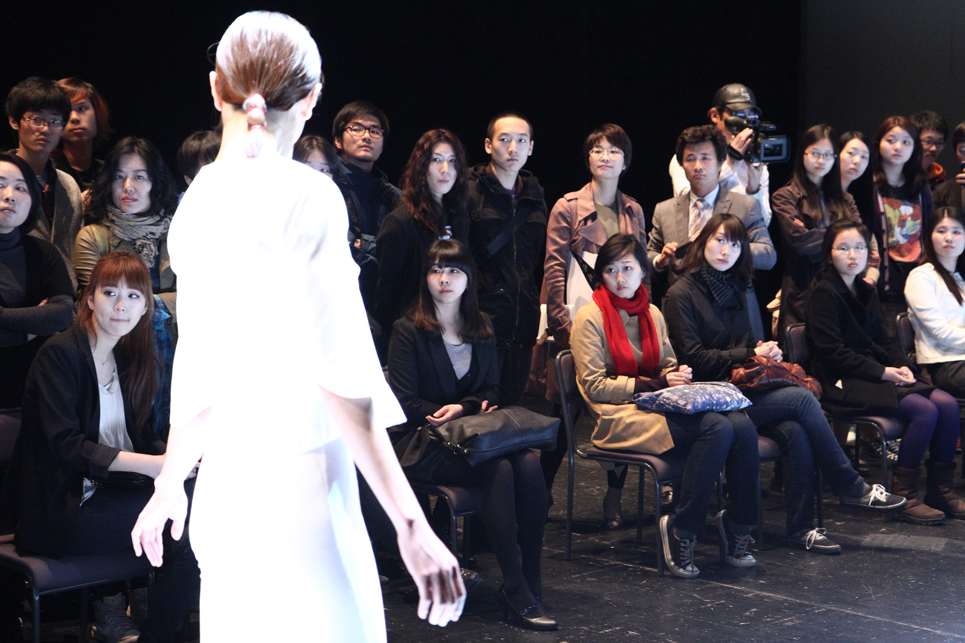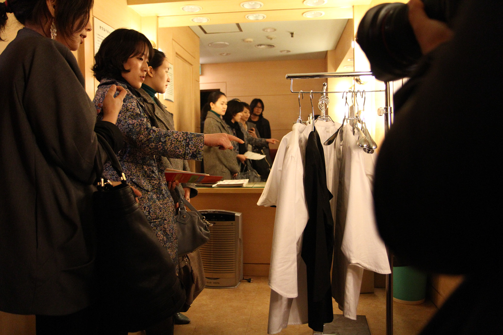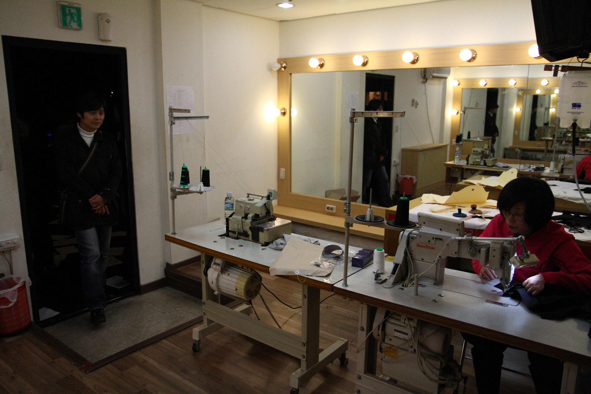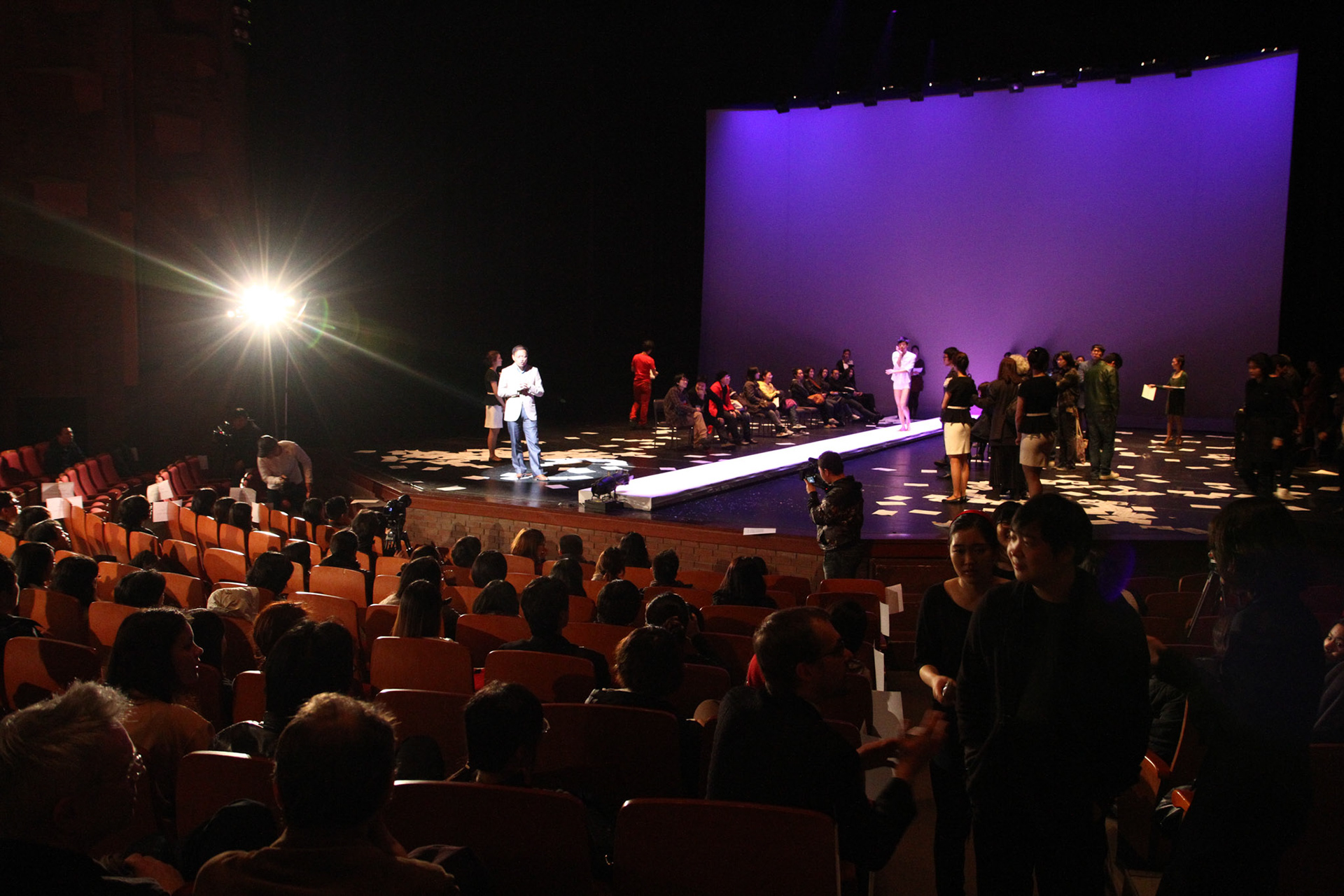 “With his new work entitled myfashionshow, Fleischmann steps literally into unchartered territory with his art. His exploration of North Korea´s special economic zone is transformed into an immersive theater environment that leads the spectator on an imaginary business trip from South to North Korea. Moving from the lobby, across the theater and backstage, becomes a metaphorical journey through the borderlines, production conditions, business privileges, educational purposes and media rhetoric around the Kaesong Industrial Complex. The activities are centered around the catwalk, which divides the stage into two parts. The models move in slow motion as a counter statement against the speed of the fashion industry, while master of ceremonies Young June Lee guides spectator-protagonists through the evening, performing live critique in the style of a Brechtian moderator. Fleischmann is launching the format of a fashion show towards a paradigm shift in our perception of commodities. His contextual approach makes the oft-obscured relationship between labour and commodity the subject matter in myfashionshow. While the myfashionshow trip is imaginary, the protagonists are authentic. The owner of the factory, where the garments were produced, grants the spectators an audience while the seamstress is re-enacting the sewing of the original sample shirts in real time.” (from the press release)