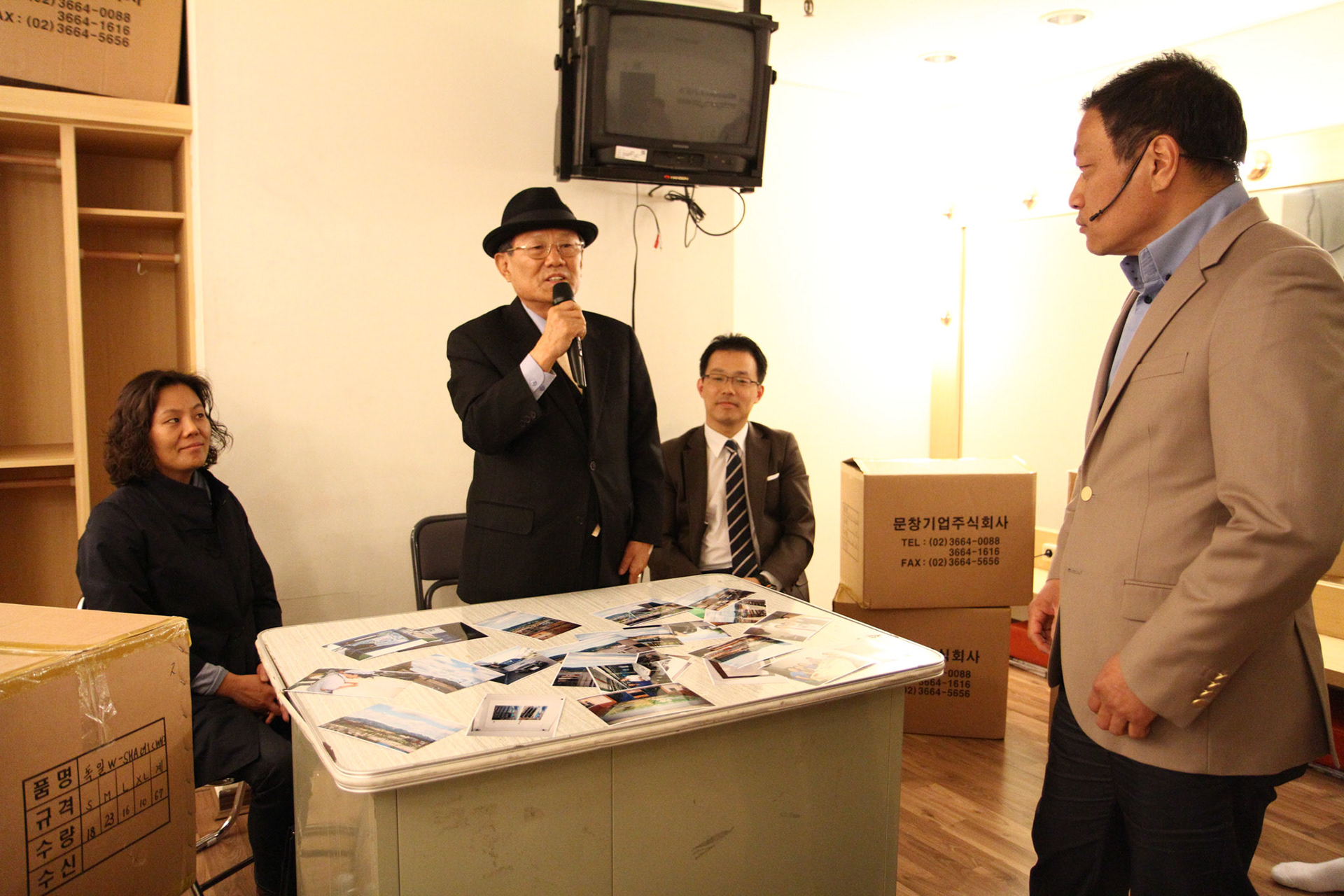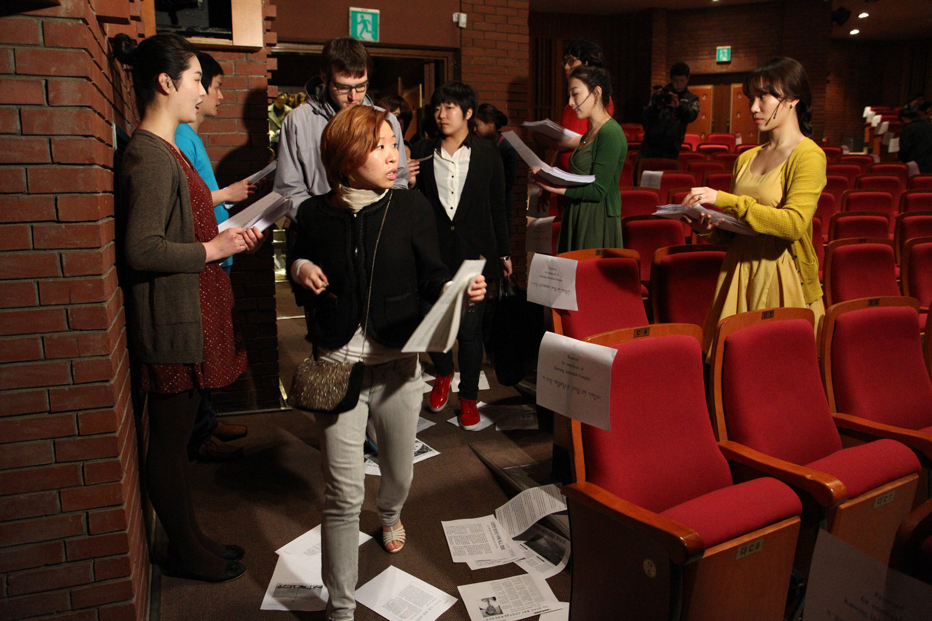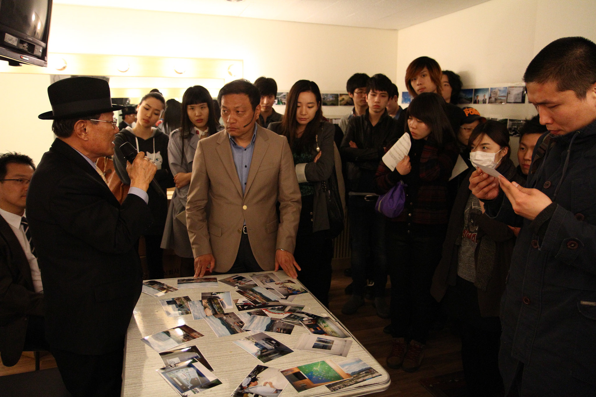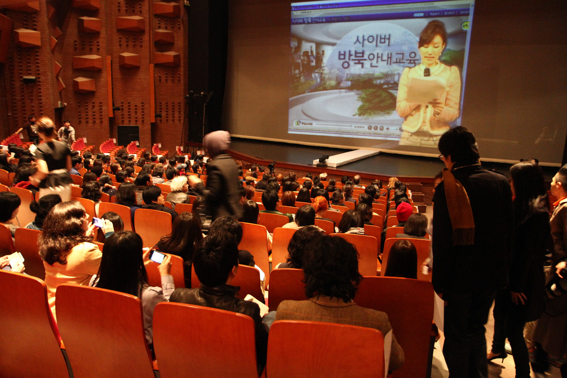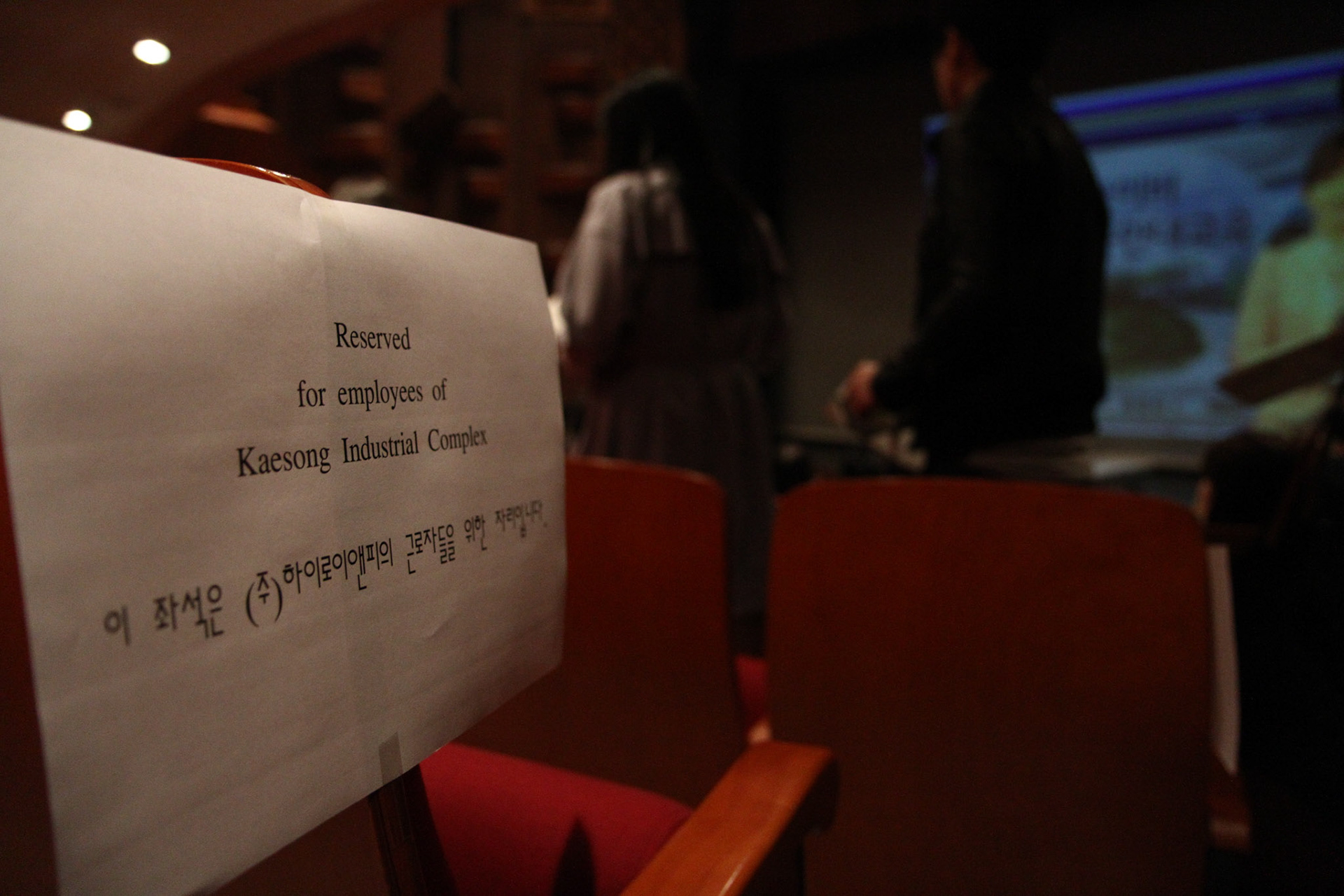 “With his new work entitled myfashionshow, Fleischmann steps literally into unchartered territory with his art. His exploration of North Korea´s special economic zone is transformed into an immersive theater environment that leads the spectator on an imaginary business trip from South to North Korea. Moving from the lobby, across the theater and backstage, becomes a metaphorical journey through the borderlines, production conditions, business privileges, educational purposes and media rhetoric around the Kaesong Industrial Complex. The activities are centered around the catwalk, which divides the stage into two parts. The models move in slow motion as a counter statement against the speed of the fashion industry, while master of ceremonies Young June Lee guides spectator-protagonists through the evening, performing live critique in the style of a Brechtian moderator. Fleischmann is launching the format of a fashion show towards a paradigm shift in our perception of commodities. His contextual approach makes the oft-obscured relationship between labour and commodity the subject matter in myfashionshow. While the myfashionshow trip is imaginary, the protagonists are authentic. The owner of the factory, where the garments were produced, grants the spectators an audience while the seamstress is re-enacting the sewing of the original sample shirts in real time.” (from the press release)