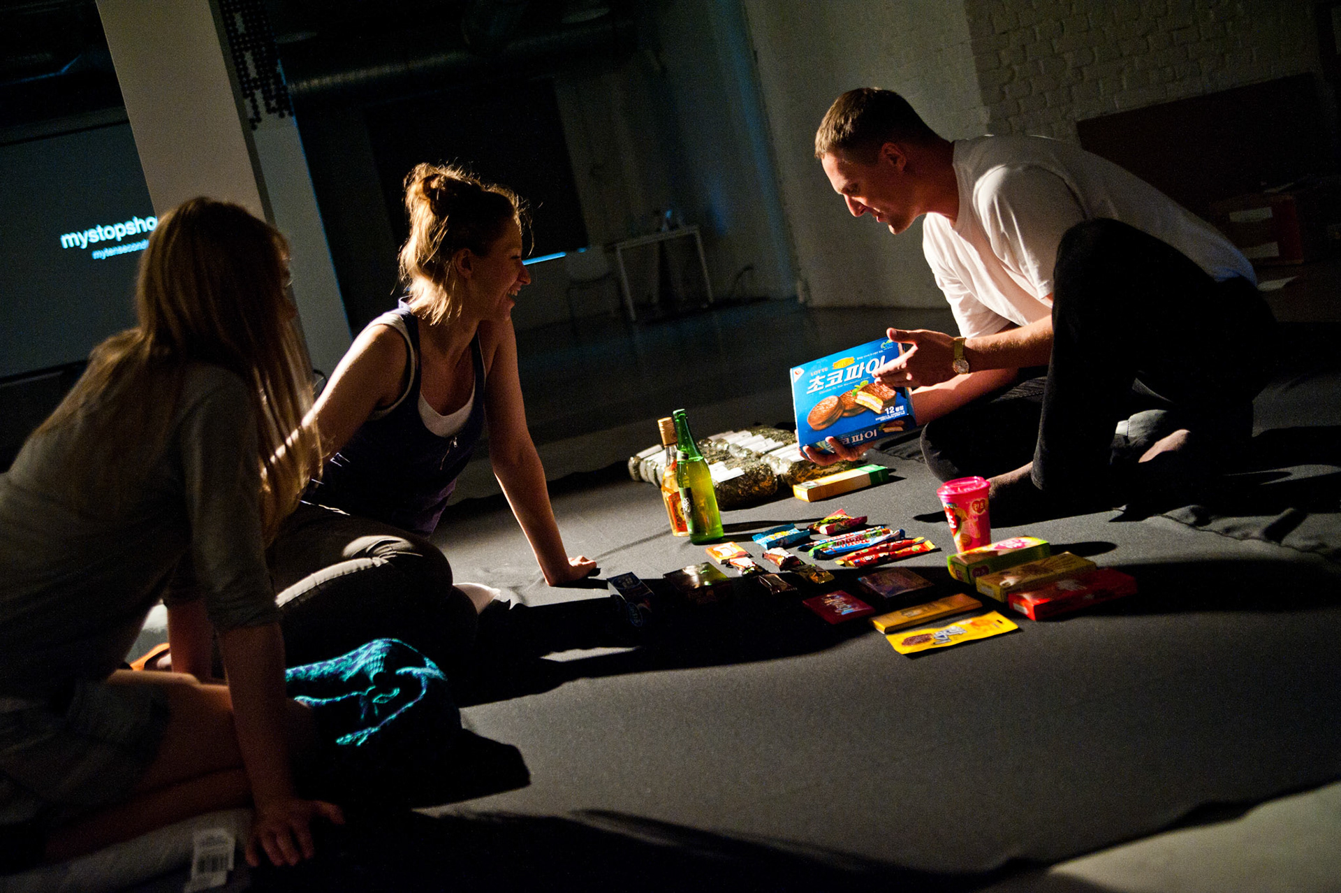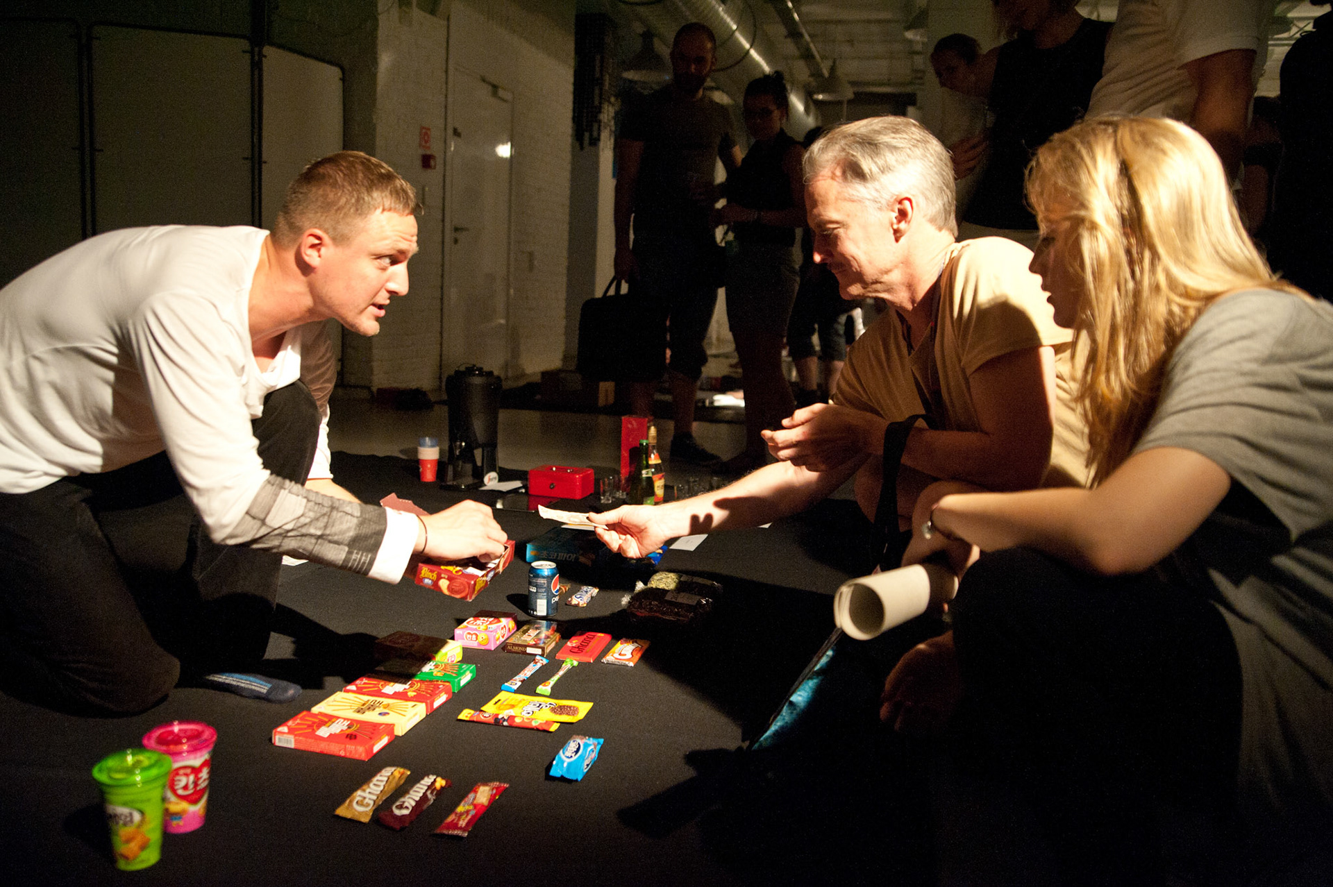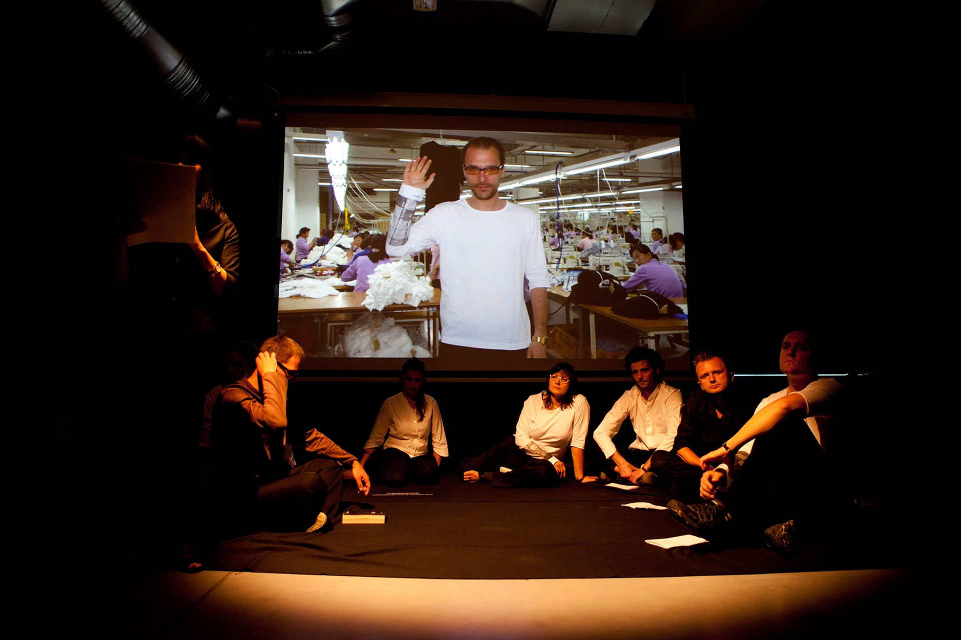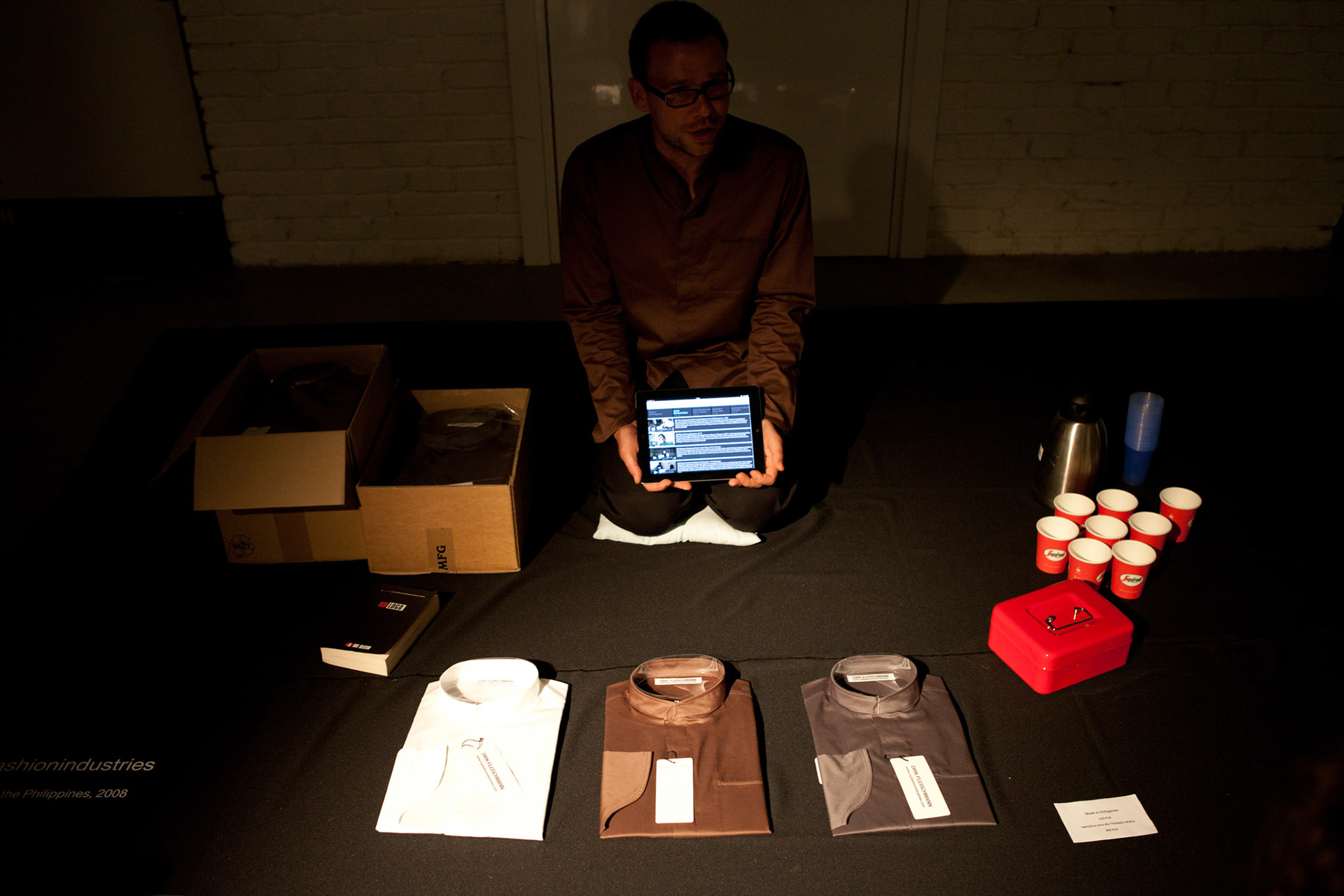 mysaleshow is structured like a flea market. The audience may stroll and communicate with the artist and the actors. Fleischmann offers products that he produced with his business art projects, such as chocolate, chicken eggs, lamps, watches, carbon credits and the Malta Festival promotion shirts. This variety is as schizophrenic as what we know, but never understood from other multinational, diversified business conglomerates. Fleischmann acts out this schizophrenia together with eight alter egos. Each of them represents another business/product. They will take the audience on a journey that starts with a herb tea from Fleischmann's hometown and ends in a special economic zone on North Korean territory where he designed and produced the Malta Festival shirt. His personal artistic micro-narrative tells a capitalist fairy tail of success. While others fly high, Fleischmann's project is like a low-level flight, where the grounds of our capitalist system remain in sight.