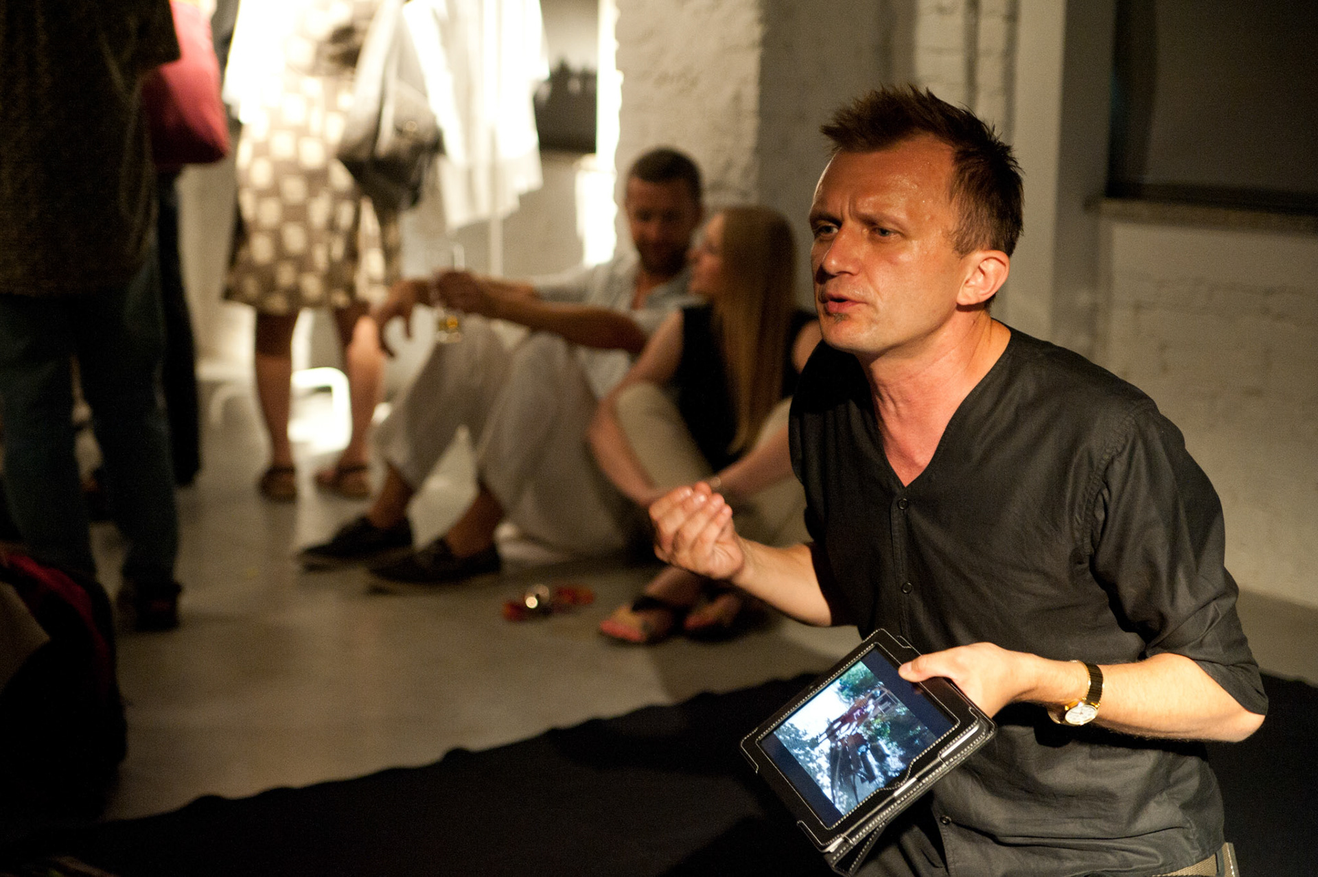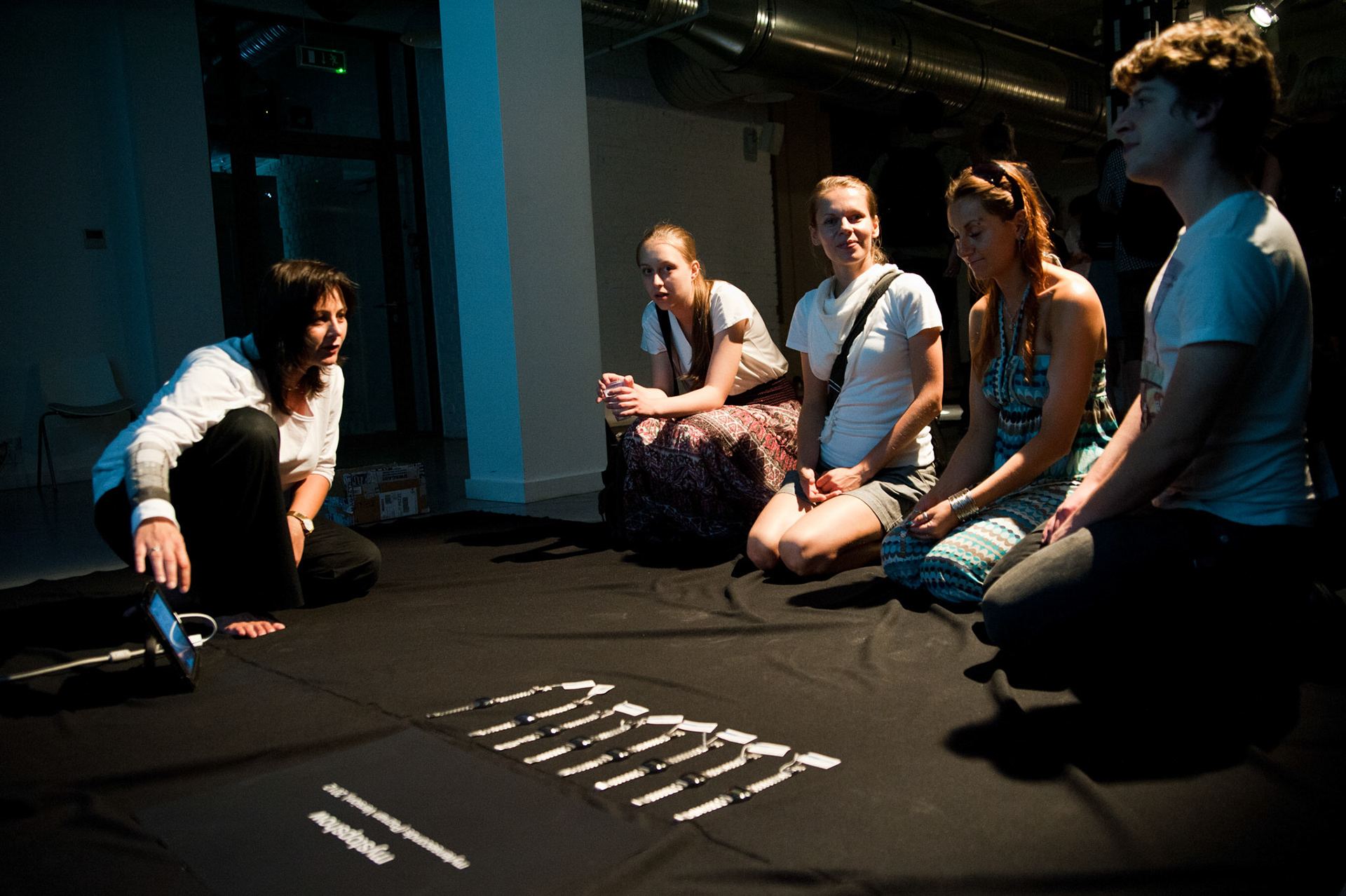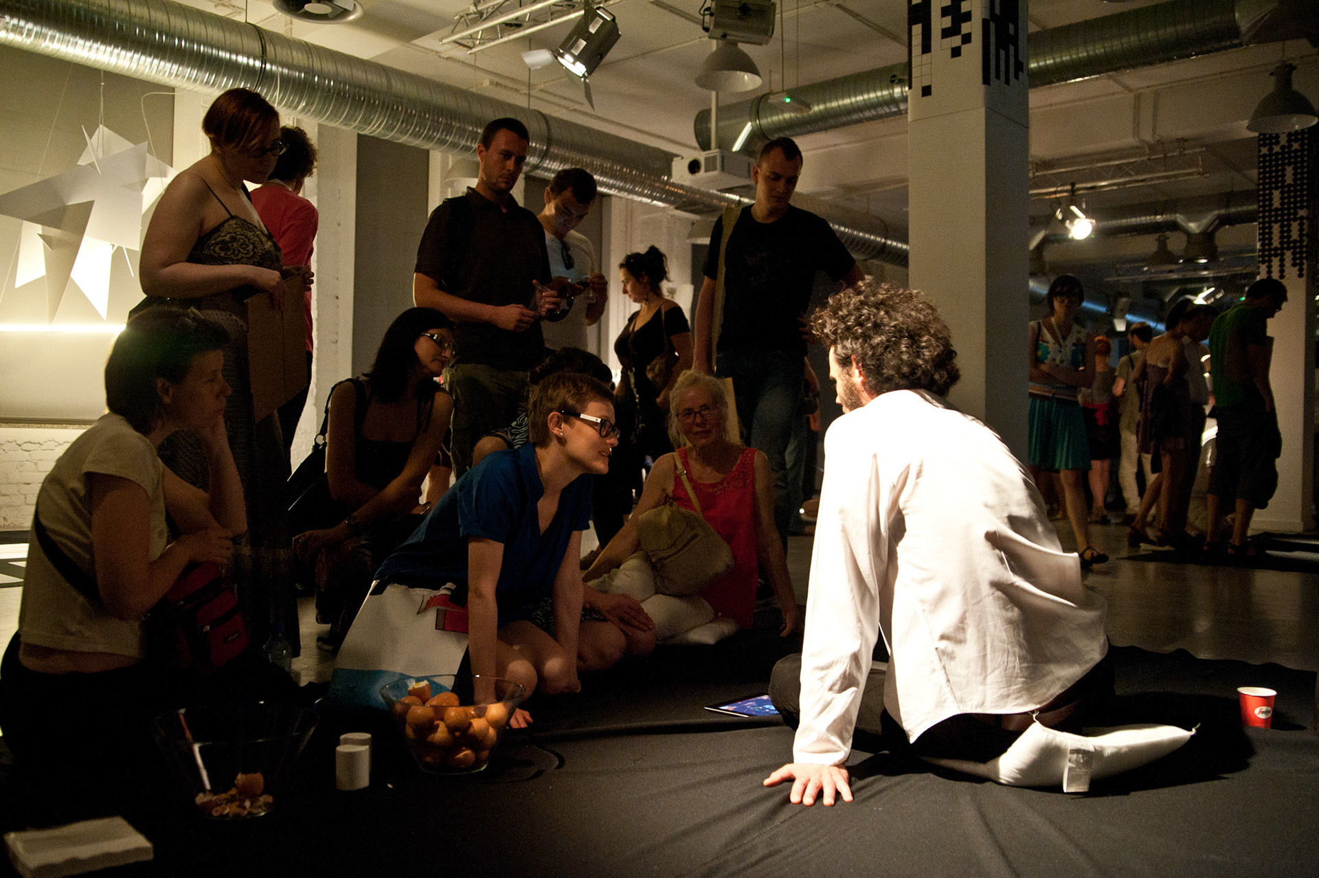 mysaleshow is structured like a flea market. The audience may stroll and communicate with the artist and the actors. Fleischmann offers products that he produced with his business art projects, such as chocolate, chicken eggs, lamps, watches, carbon credits and the Malta Festival promotion shirts. This variety is as schizophrenic as what we know, but never understood from other multinational, diversified business conglomerates. Fleischmann acts out this schizophrenia together with eight alter egos. Each of them represents another business/product. They will take the audience on a journey that starts with a herb tea from Fleischmann's hometown and ends in a special economic zone on North Korean territory where he designed and produced the Malta Festival shirt. His personal artistic micro-narrative tells a capitalist fairy tail of success. While others fly high, Fleischmann's project is like a low-level flight, where the grounds of our capitalist system remain in sight.