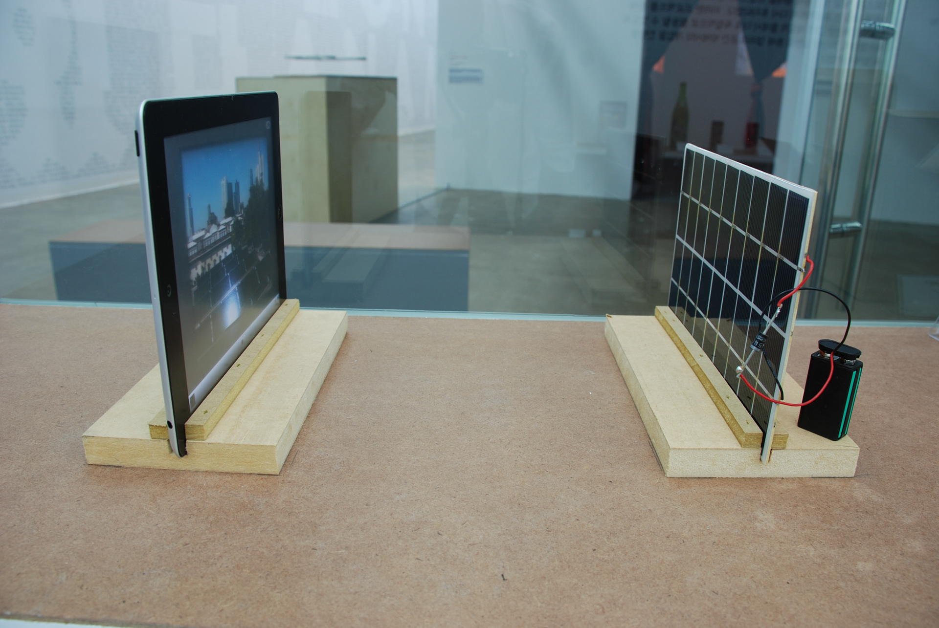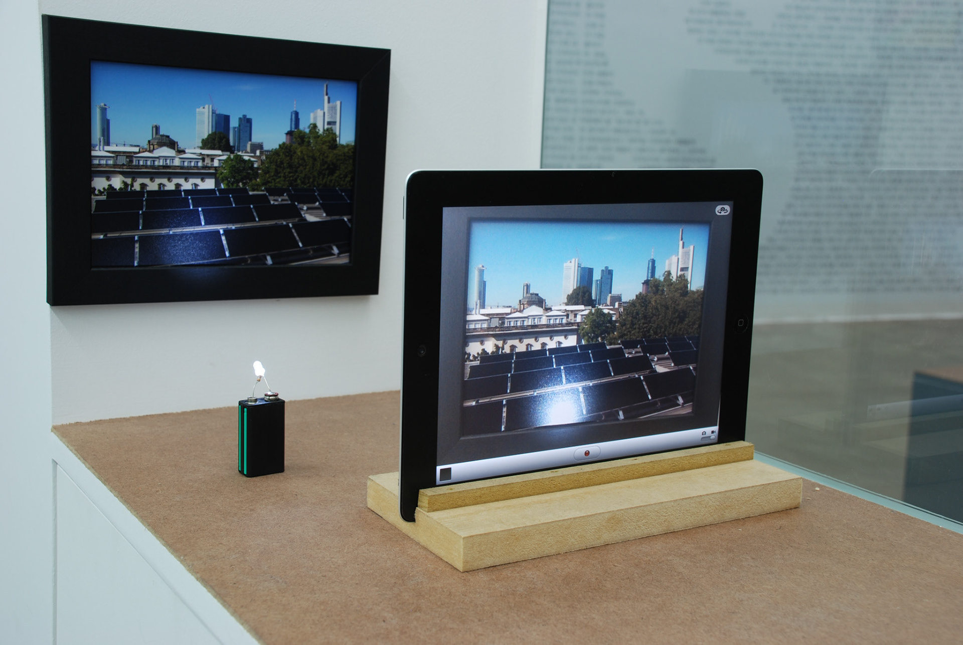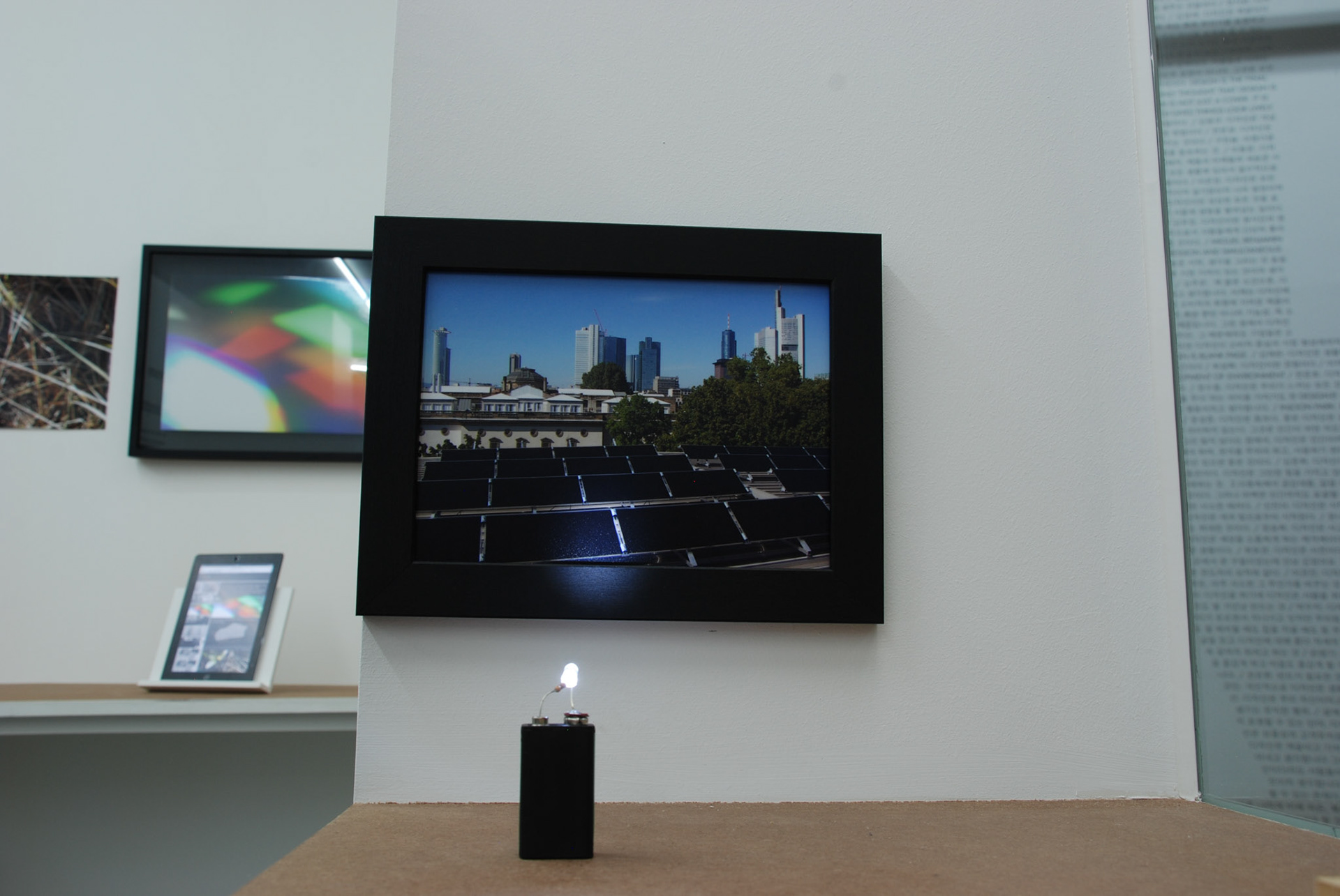Solar Light is a remake of a multiple from Fleischmann's first solo exhibition The Black Cat. The battery was charged from the light that was emitted from a tablet display that recorded a photo of mysolarpowerplant. This work is about how photographic representation transforms the subject matter.