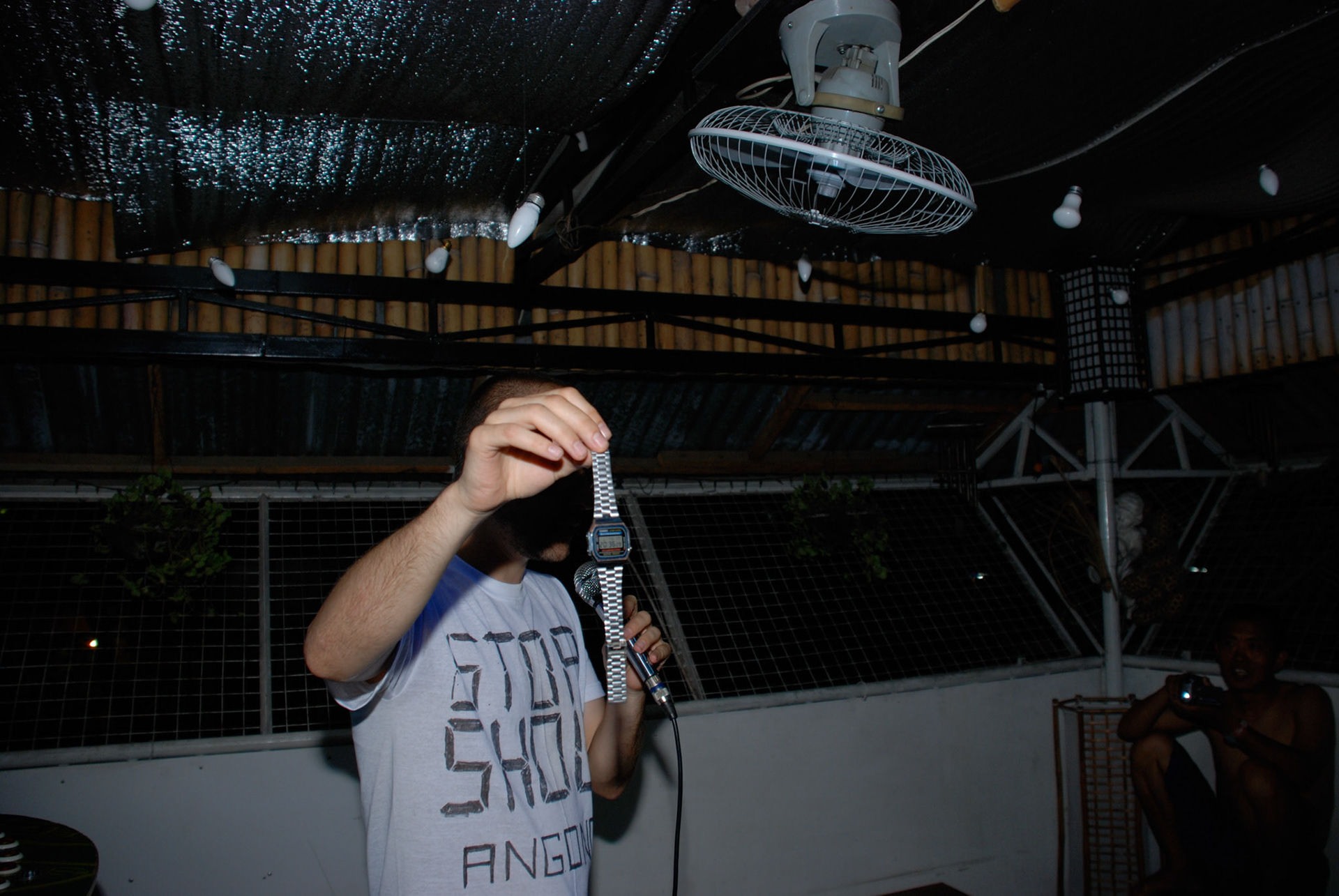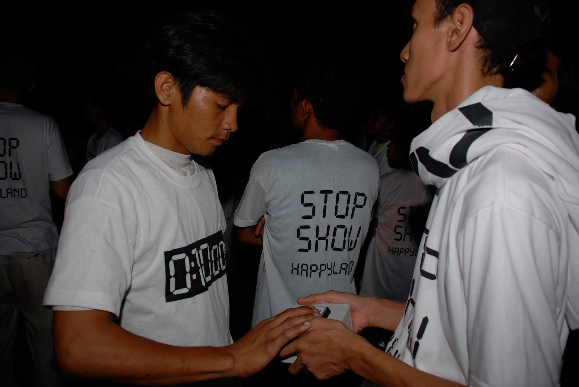 mystopshow is a collective game show. The game is easily comprehended. The player attempts to stop a certain time period (e.g. 10:00 seconds) as precisely as possible with a regular stop watch, without seeing the display. mystopshow is an ongoing project in several variations, which are specifically developed for different situations.
