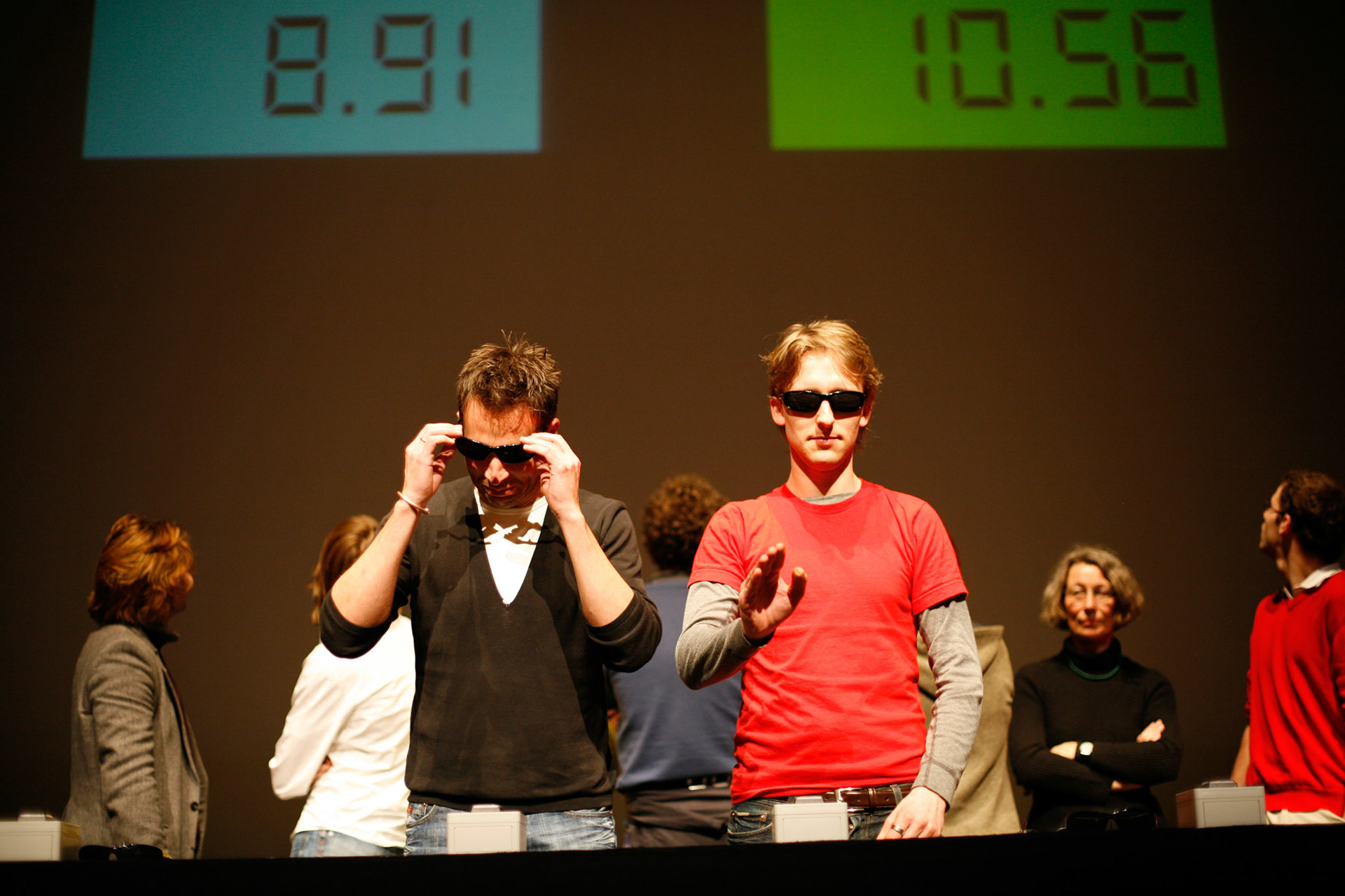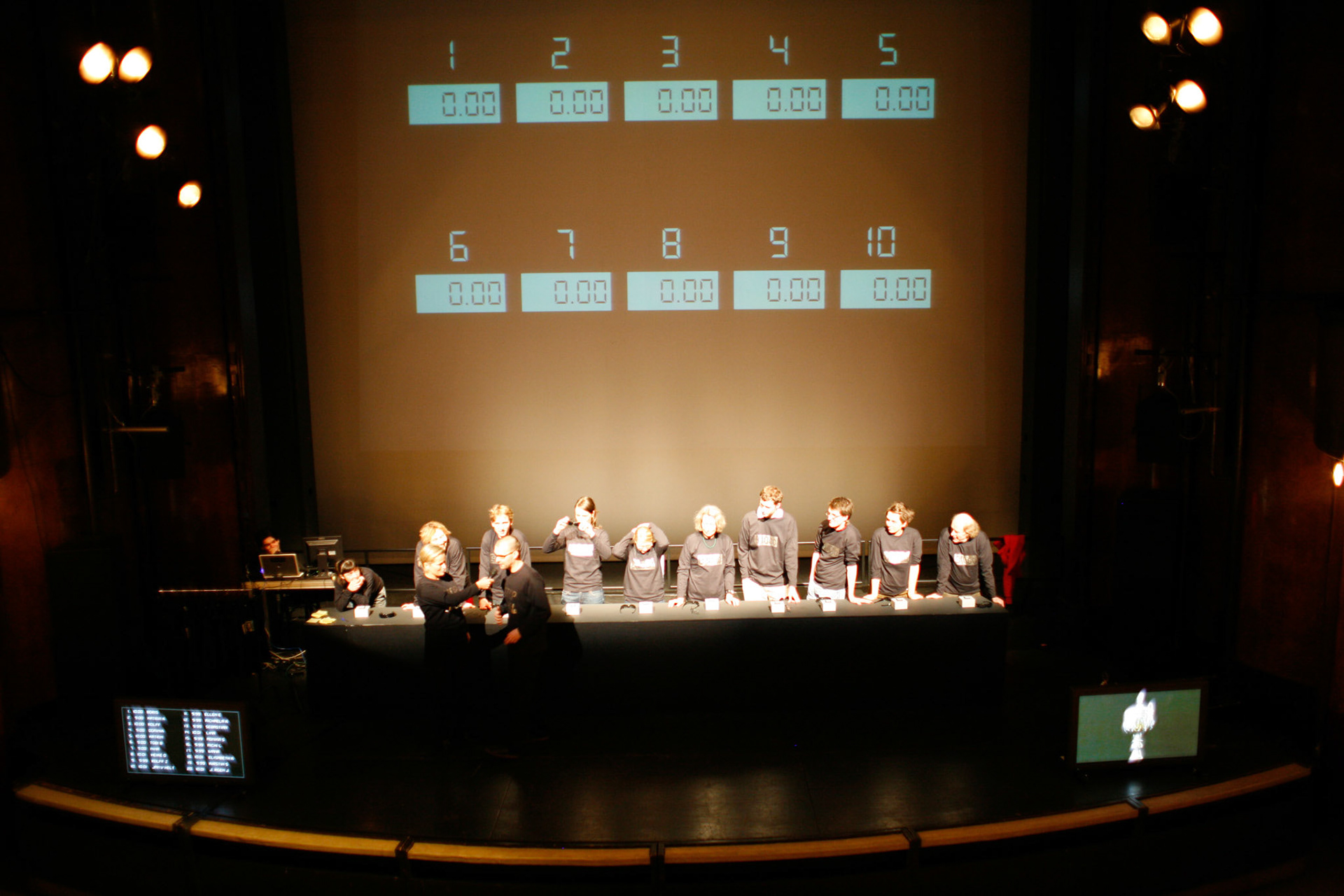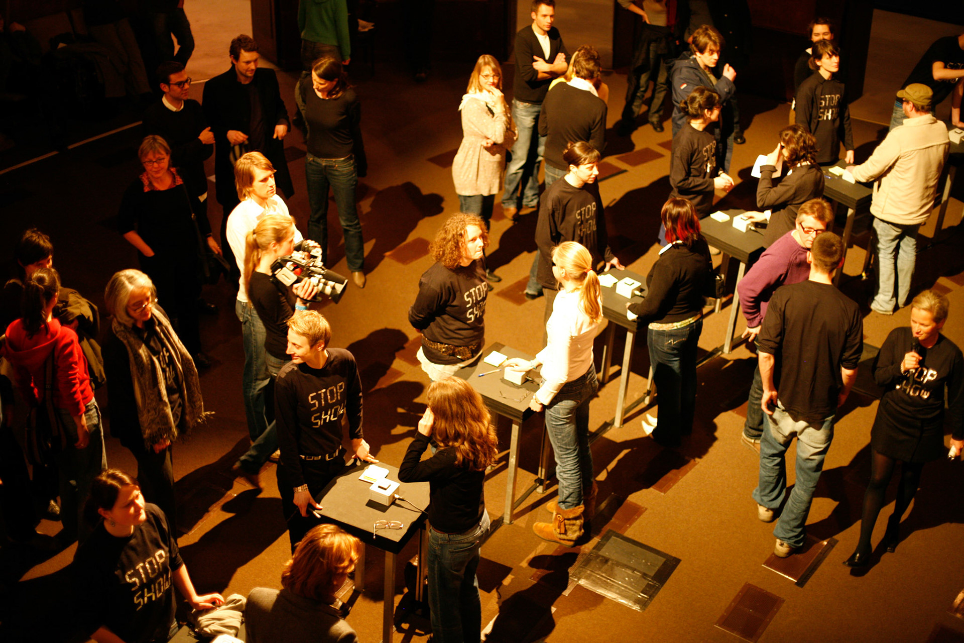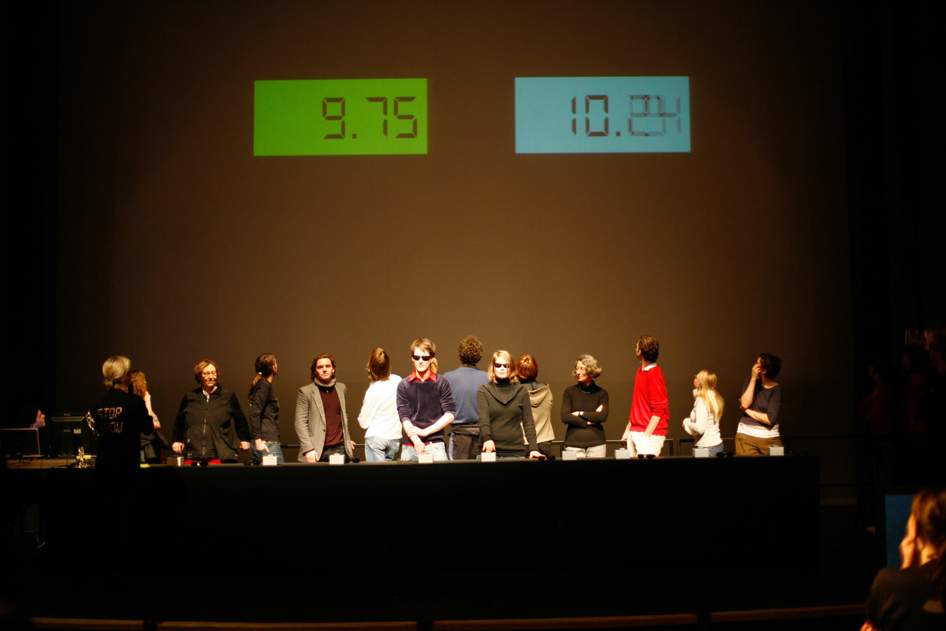 mystopshow is a collective game show. The game is easily comprehended. The player attempts to stop a certain time period (e.g. 10:00 seconds) as precisely as possible with a regular stop watch, without seeing the display. mystopshow is an ongoing project in several variations, which are specifically developed for different situations.