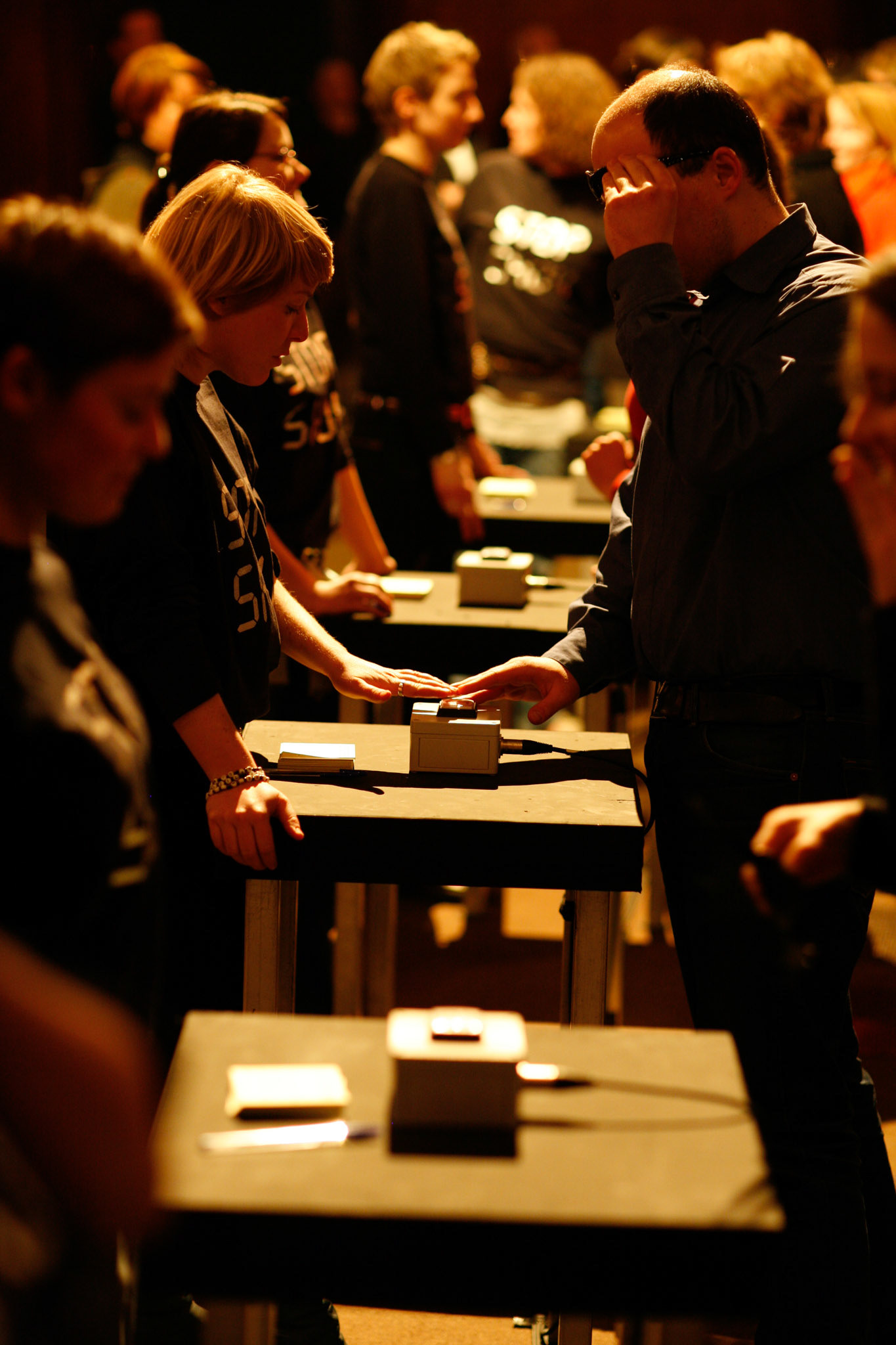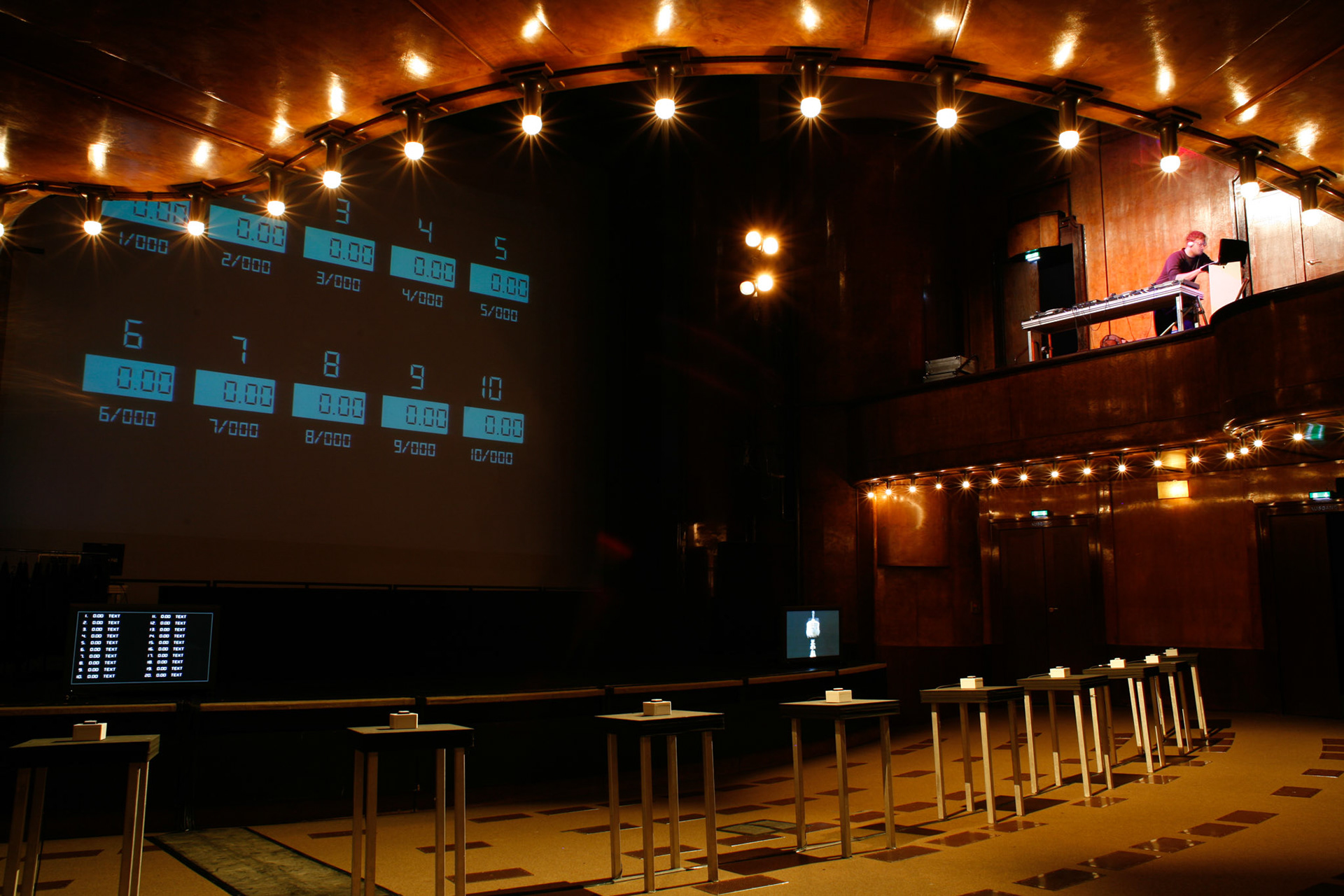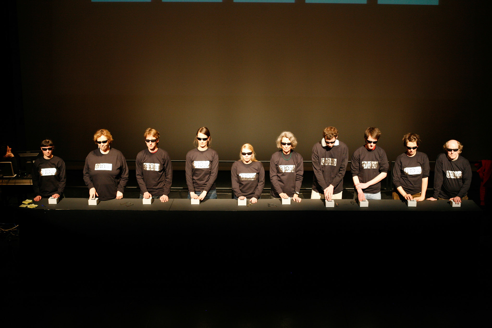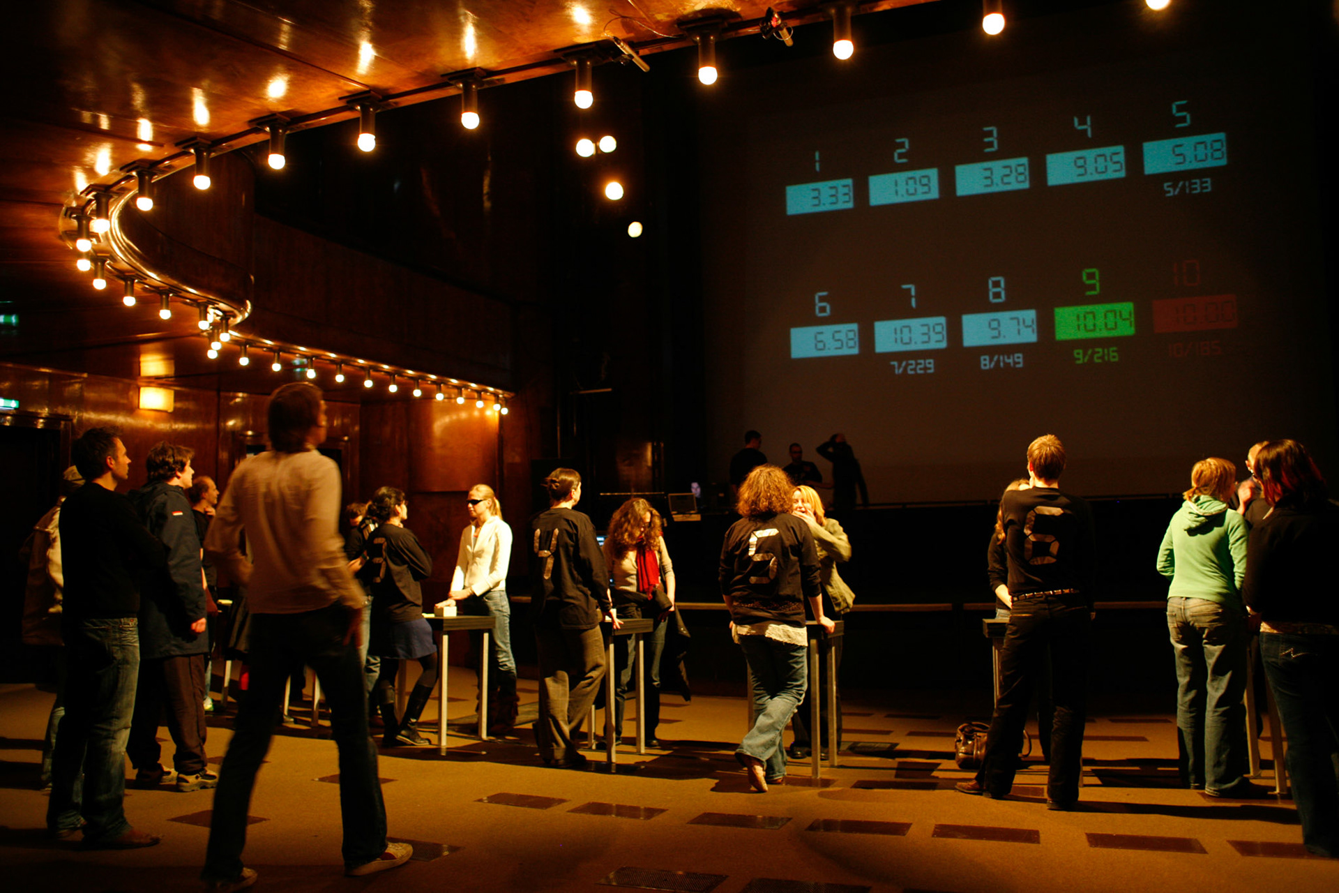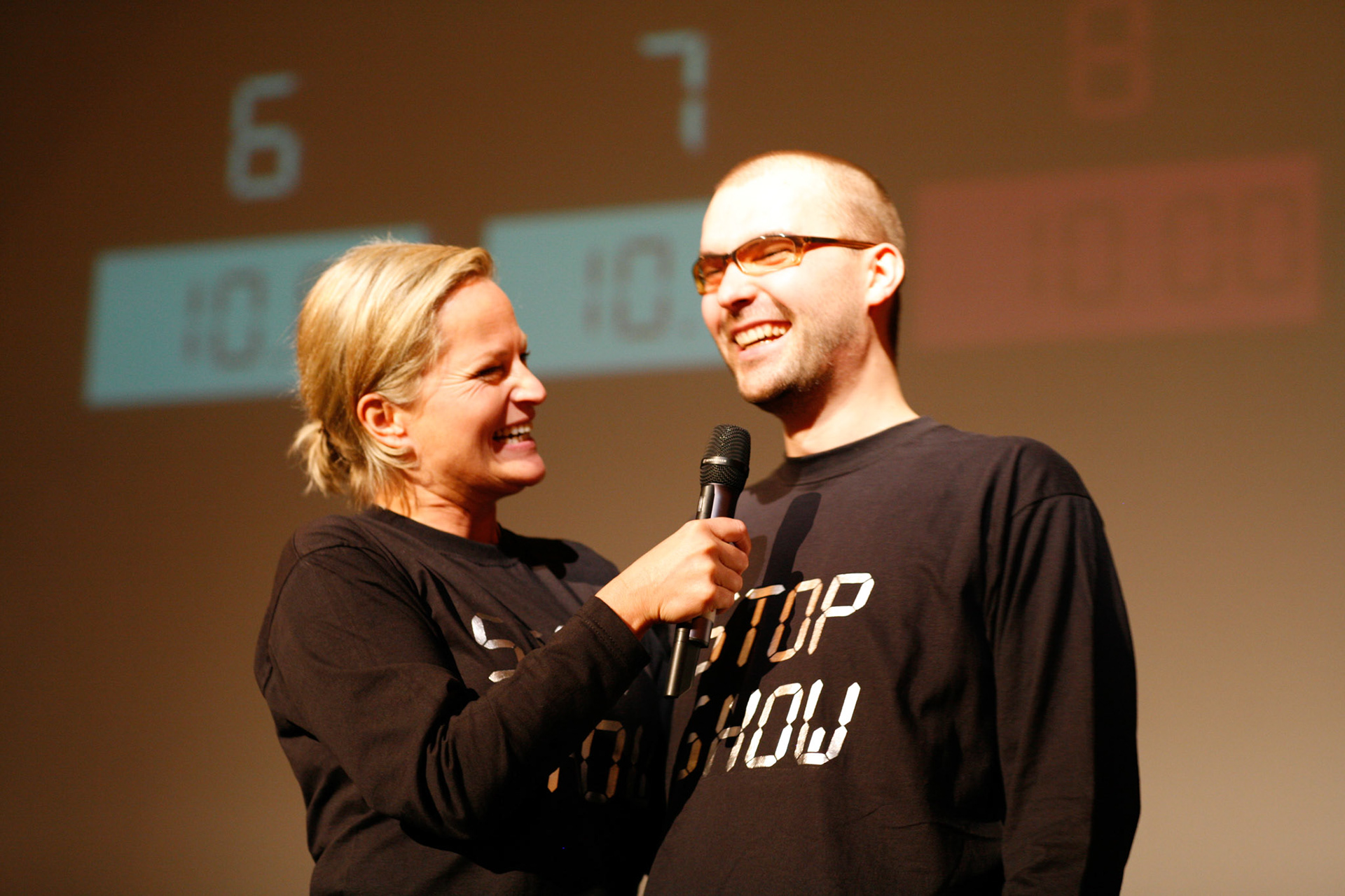 mystopshow is a collective game show. The game is easily comprehended. The player attempts to stop a certain time period (e.g. 10:00 seconds) as precisely as possible with a regular stop watch, without seeing the display. mystopshow is an ongoing project in several variations, which are specifically developed for different situations.