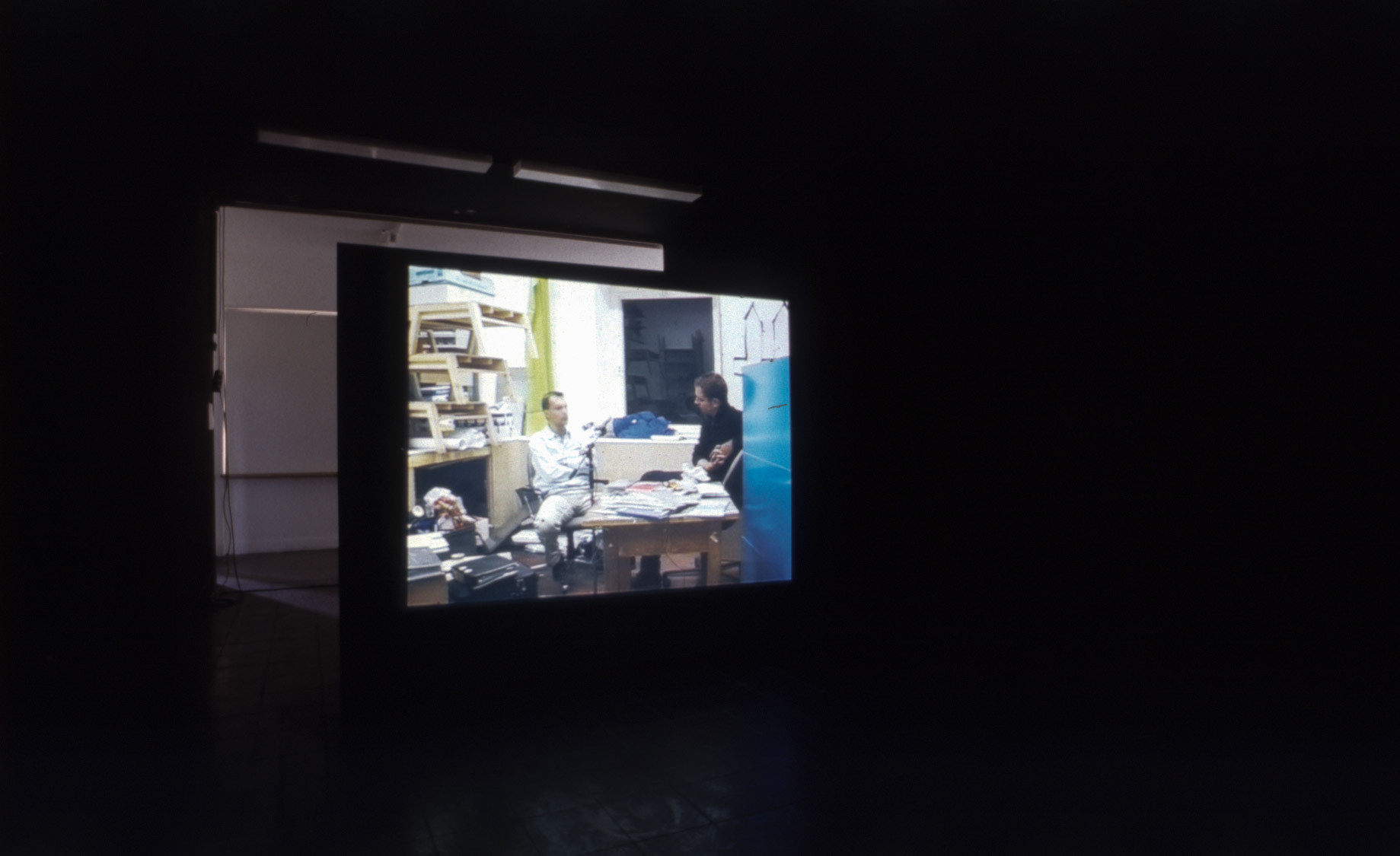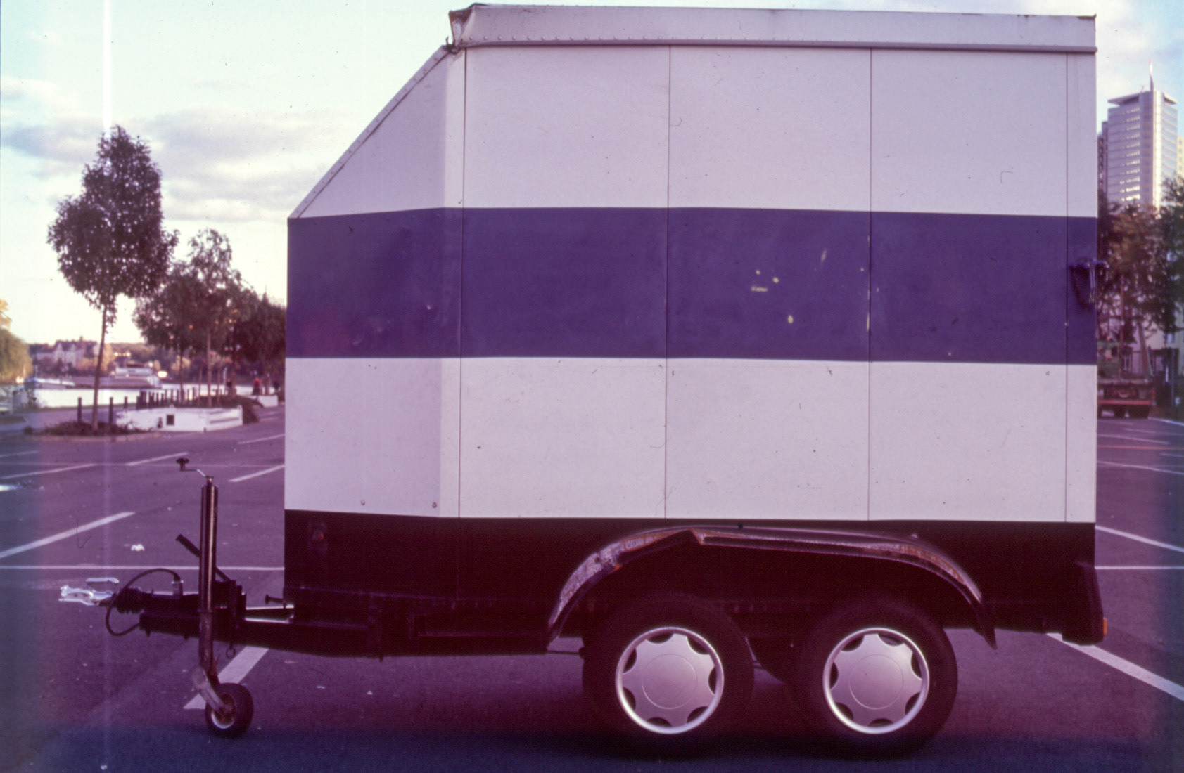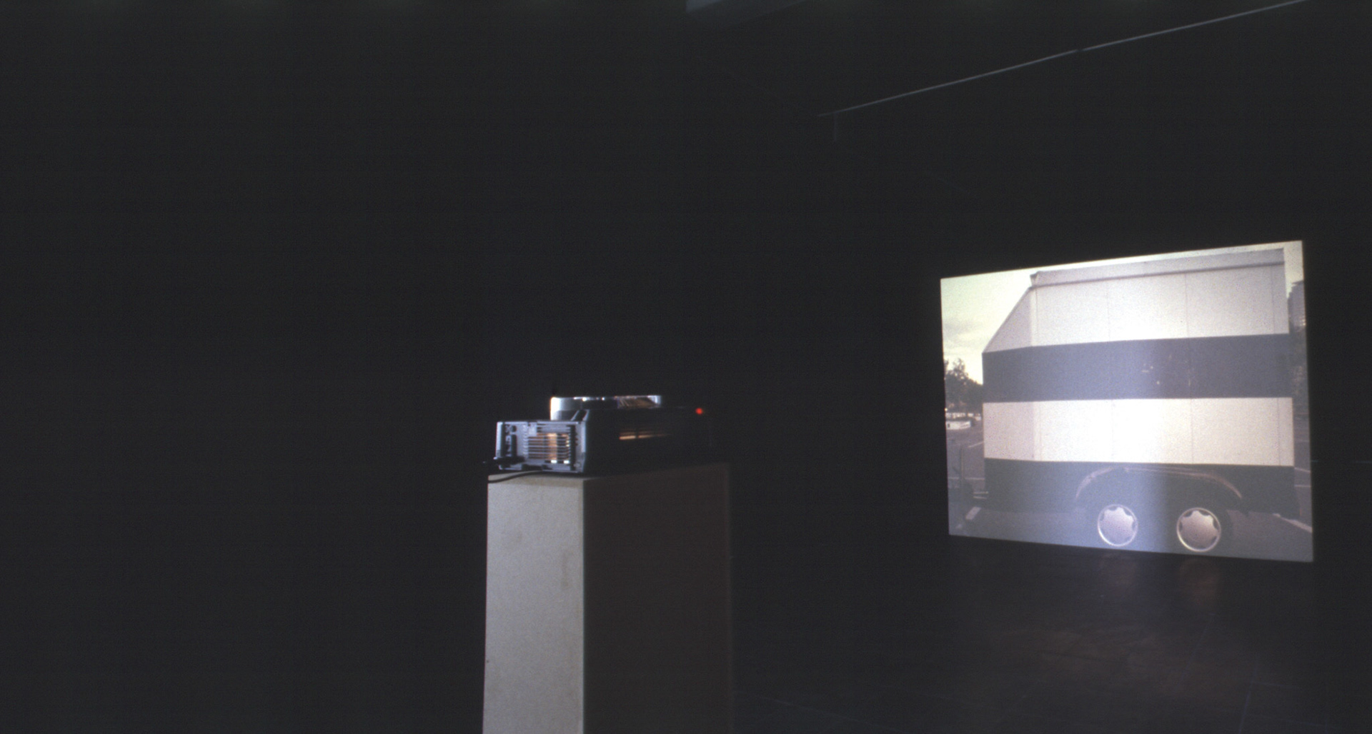 One slide of my trailer was projected permanently on a projection board, which is located in the center of the space. The visitors can hear two people talking from the back. When the visitors pass the board they find a video showing an interview, which Jochen Volz did with me about my experiences with mytrailerrental project.