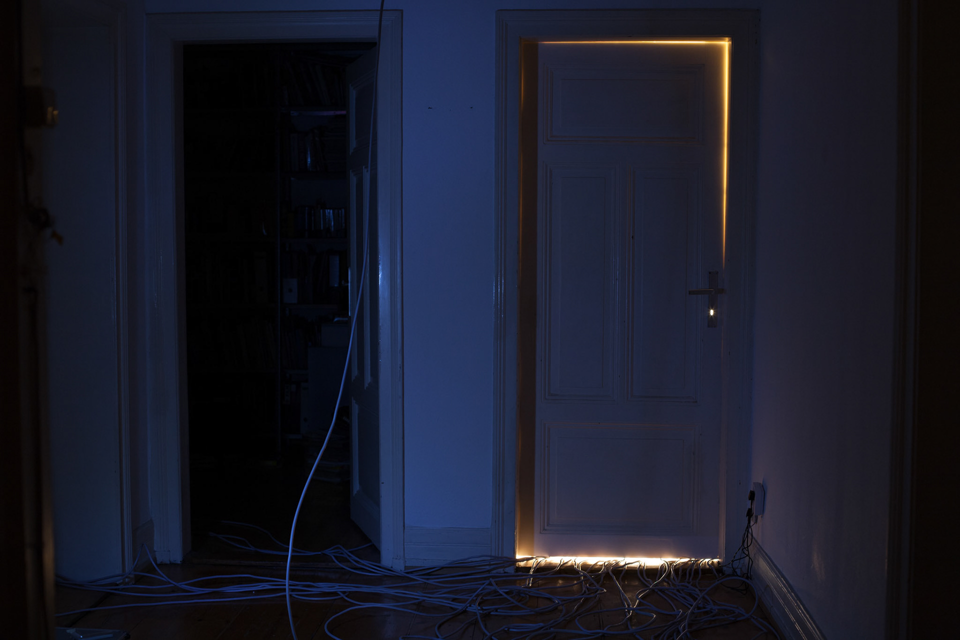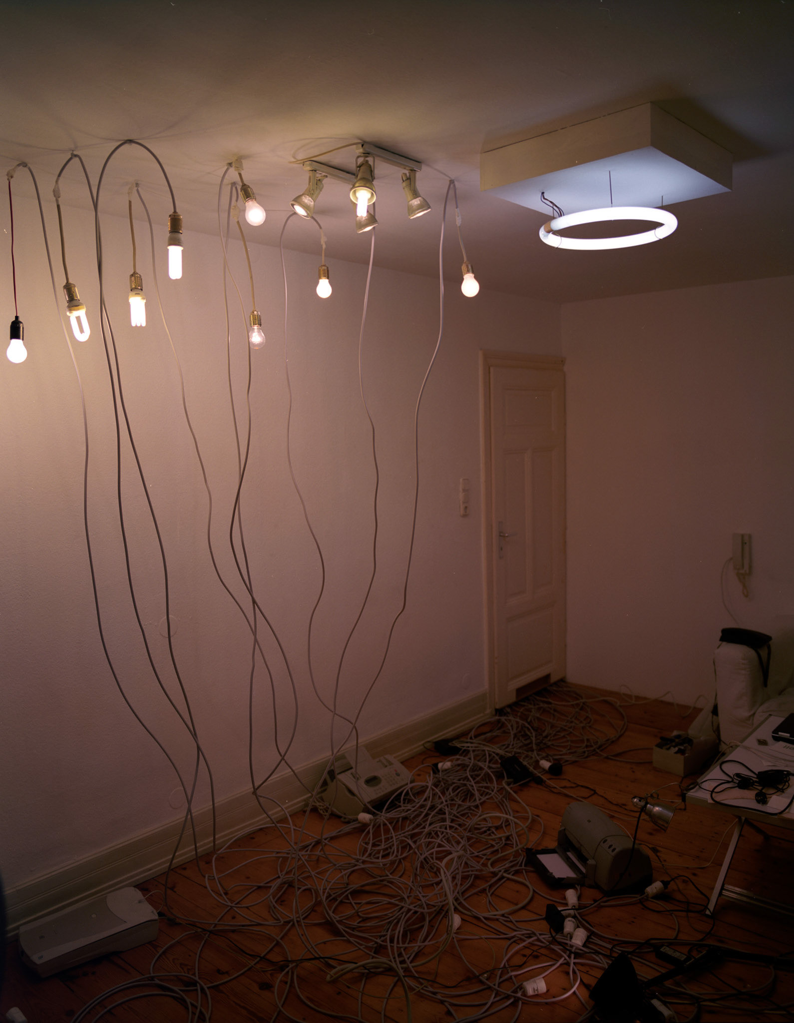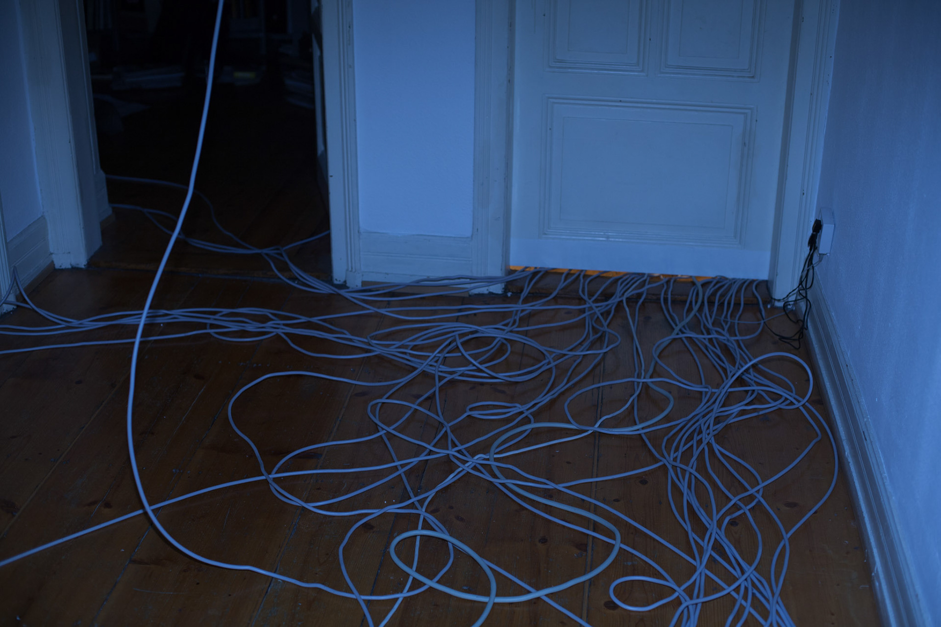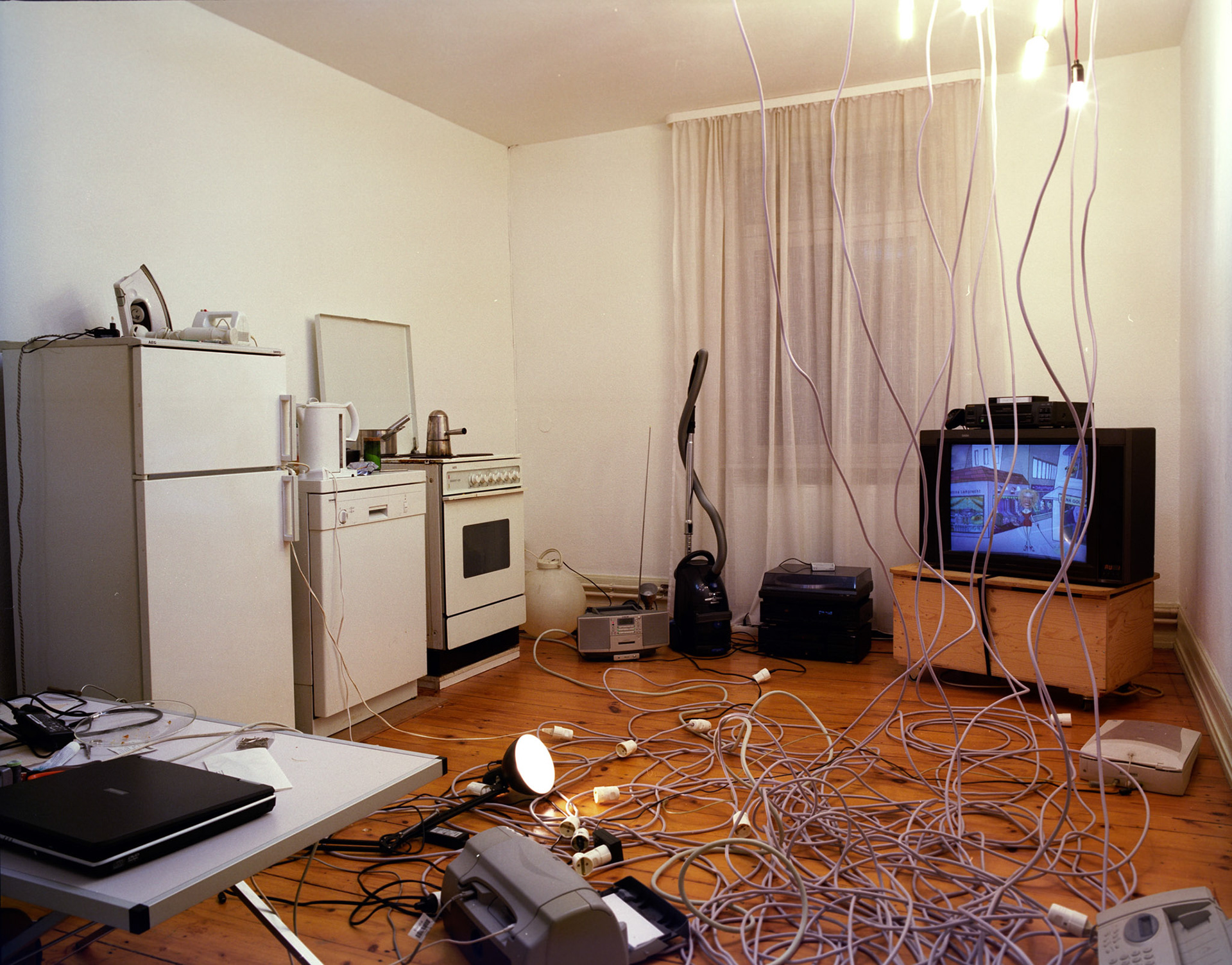 Rraum was a self-organized exhibition space in a private flat in Frankfurt. All electric appliances of the household were moved in the room, which originally was intended as the exhibition show room, but that room was kept locked during my exhibition for the visitors. All other rooms of the apartment were open. The lamps, cooker, etc. were still functioning and stayed connected with the power sources of their original position by using hundreds of meters of extension cables. Thereby the kitchen loost its function and the accessible areas of the apartment remained in darkness. The starting point of the concept of the exhibition “The Black Cat” was the fact that in this household an equivalent amount of electricity was consumed as mysolarpowerplant was producing. The title refers to a novel of same denominator by Edgar Allan Poe and to the thought experiment “The Schrödinger Cat”, which was set up by the physicist Erwin Schrödinger to demonstrate a quantum mechanics paradox. In both cases the cat is hidden, but through its absence the cat serves as a hint to another covert phenomenon. The installation shows structural and phenomenological analogies to both references.