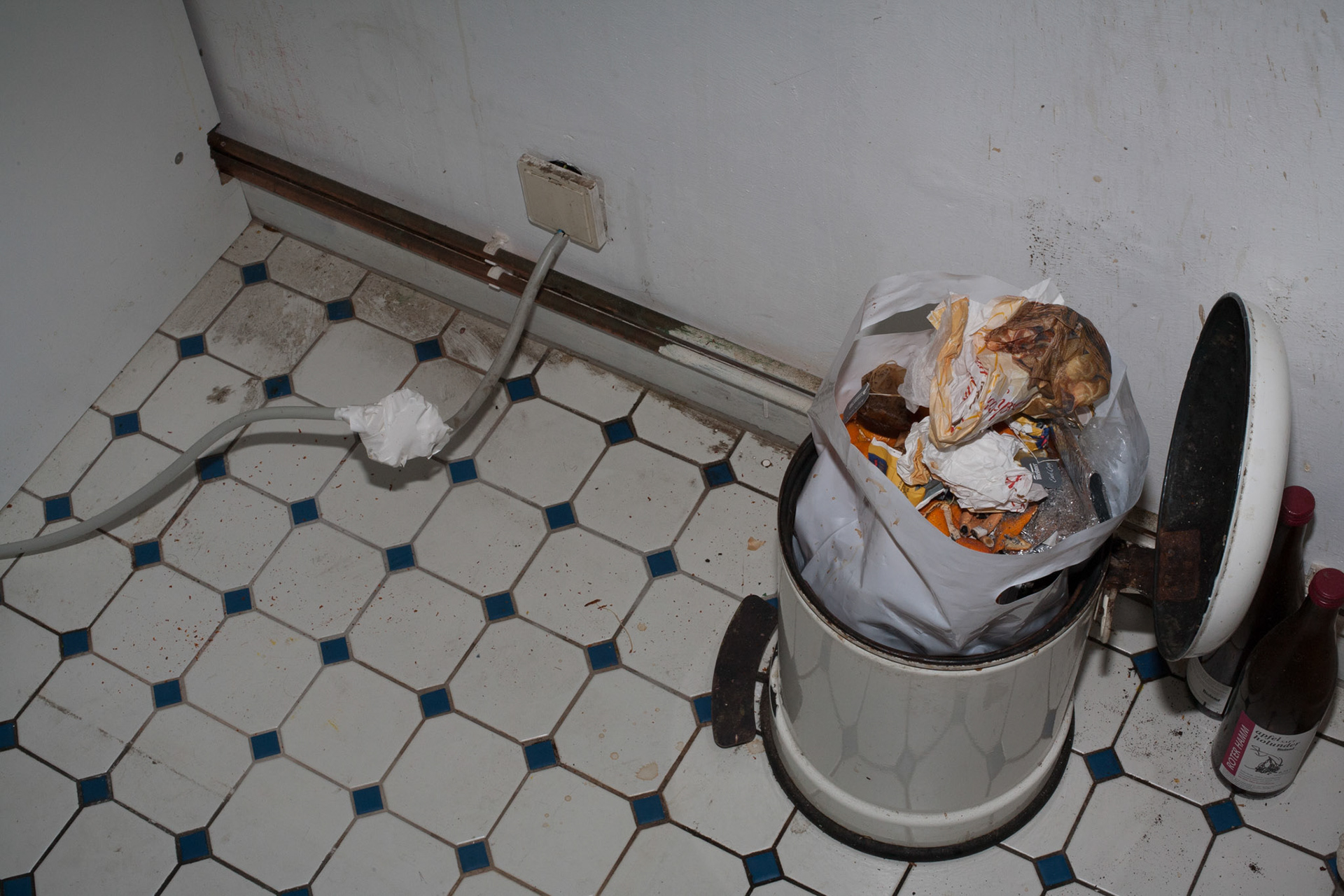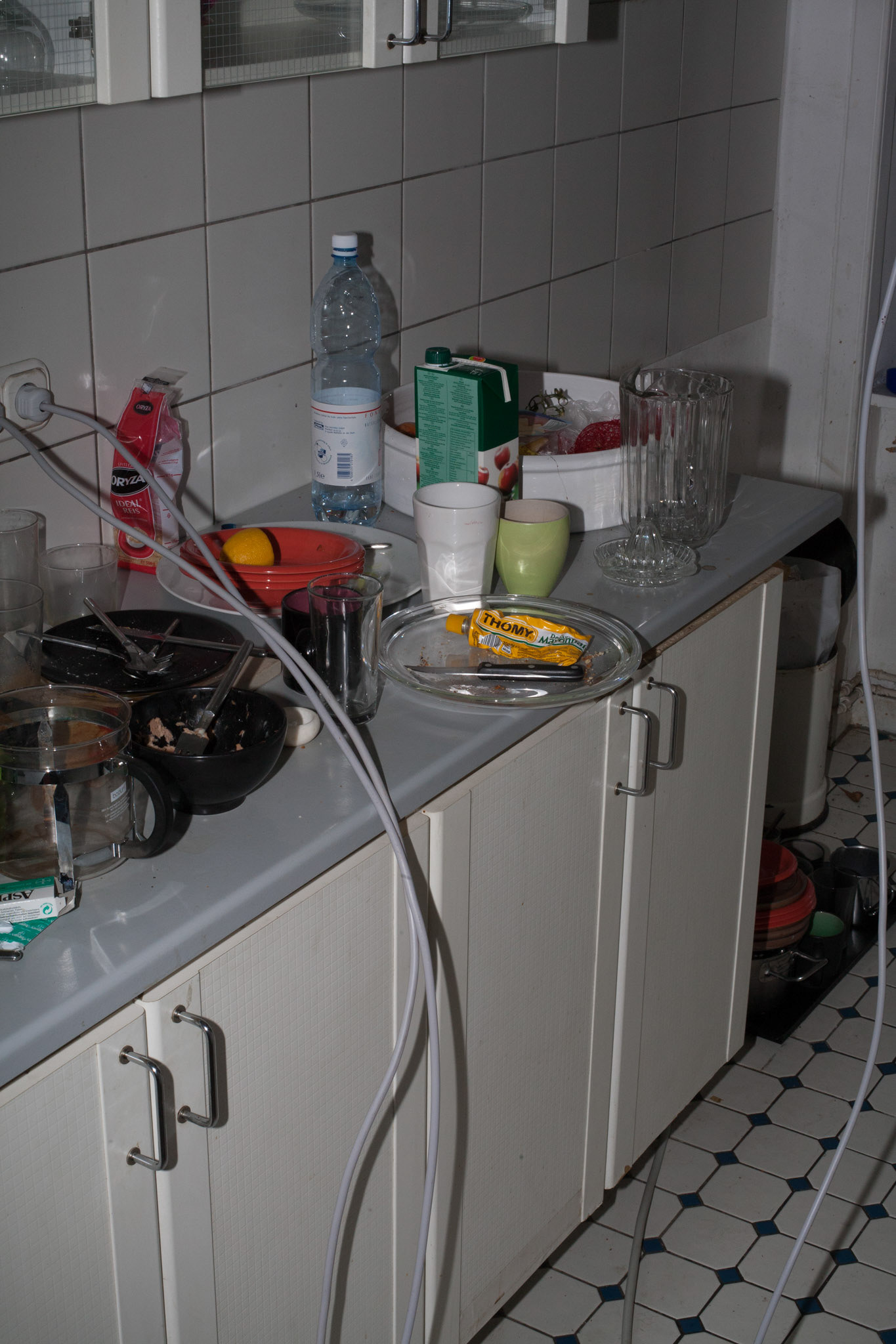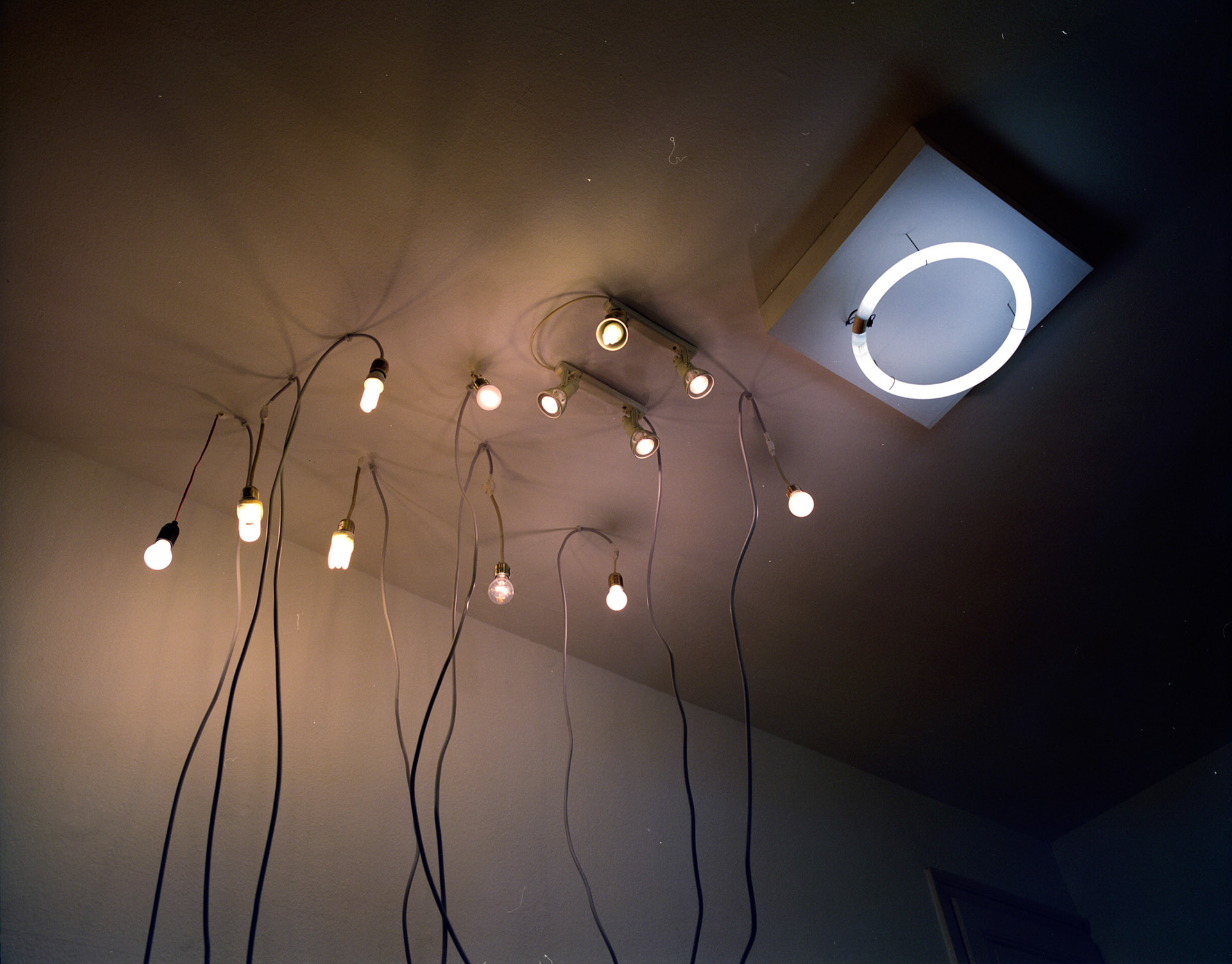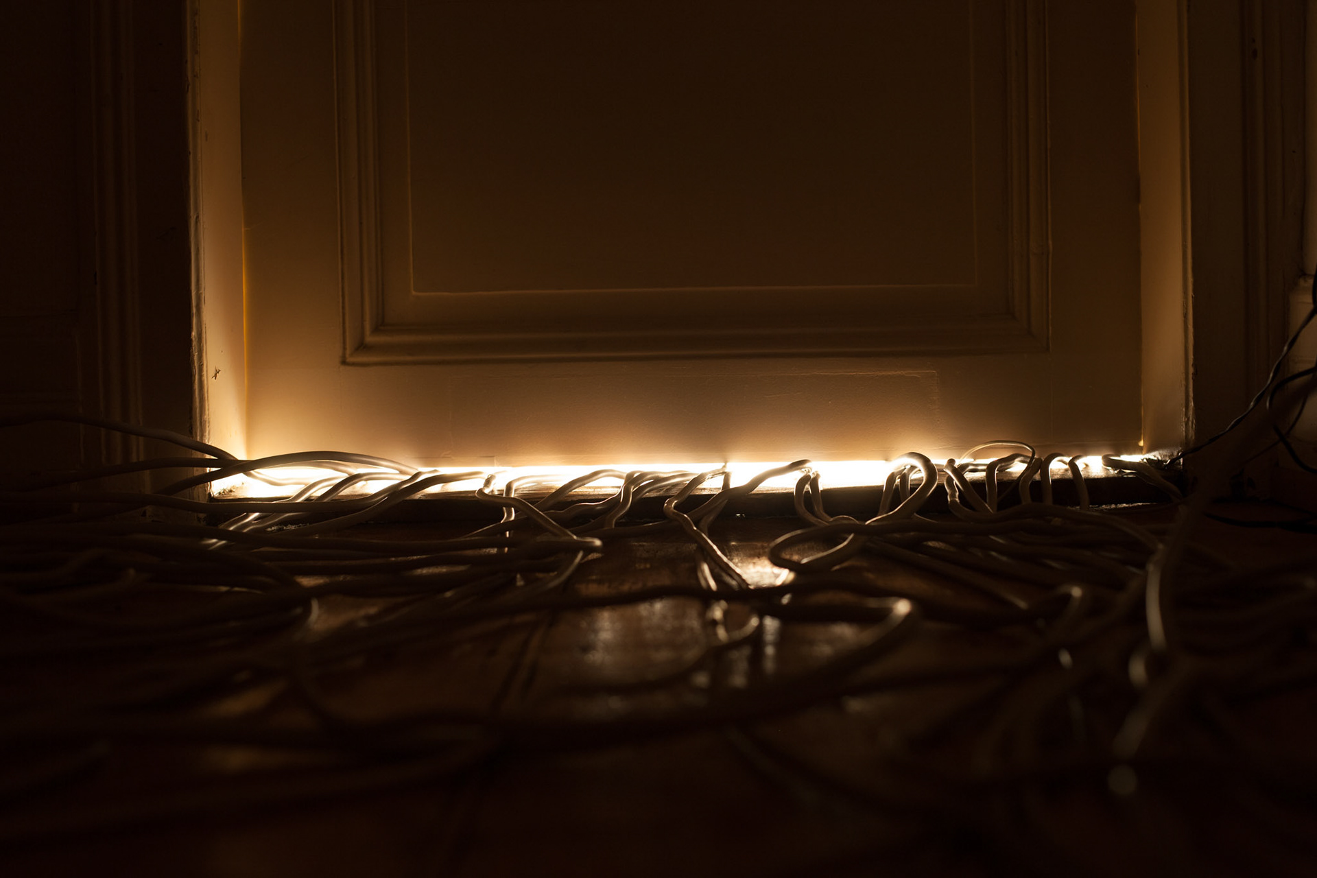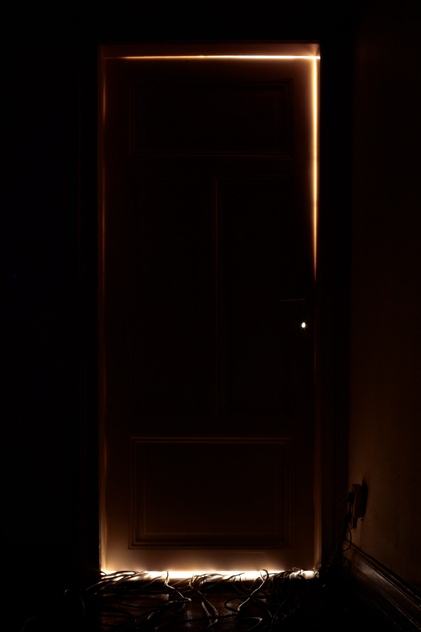 Rraum was a self-organized exhibition space in a private flat in Frankfurt. All electric appliances of the household were moved in the room, which originally was intended as the exhibition show room, but that room was kept locked during my exhibition for the visitors. All other rooms of the apartment were open. The lamps, cooker, etc. were still functioning and stayed connected with the power sources of their original position by using hundreds of meters of extension cables. Thereby the kitchen loost its function and the accessible areas of the apartment remained in darkness. The starting point of the concept of the exhibition “The Black Cat” was the fact that in this household an equivalent amount of electricity was consumed as mysolarpowerplant was producing. The title refers to a novel of same denominator by Edgar Allan Poe and to the thought experiment “The Schrödinger Cat”, which was set up by the physicist Erwin Schrödinger to demonstrate a quantum mechanics paradox. In both cases the cat is hidden, but through its absence the cat serves as a hint to another covert phenomenon. The installation shows structural and phenomenological analogies to both references.