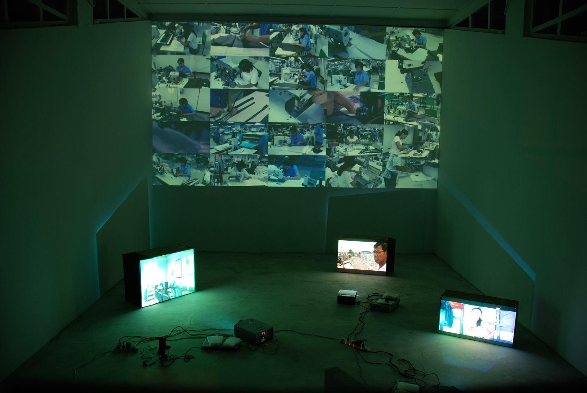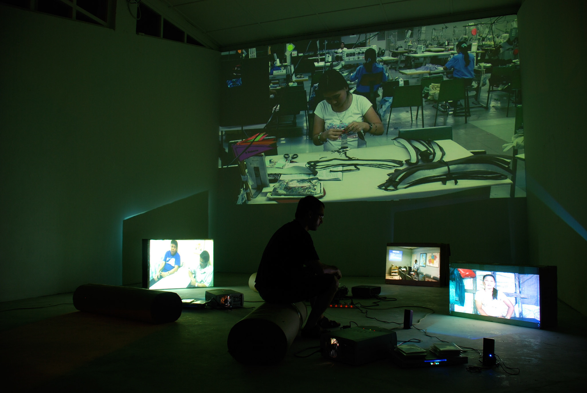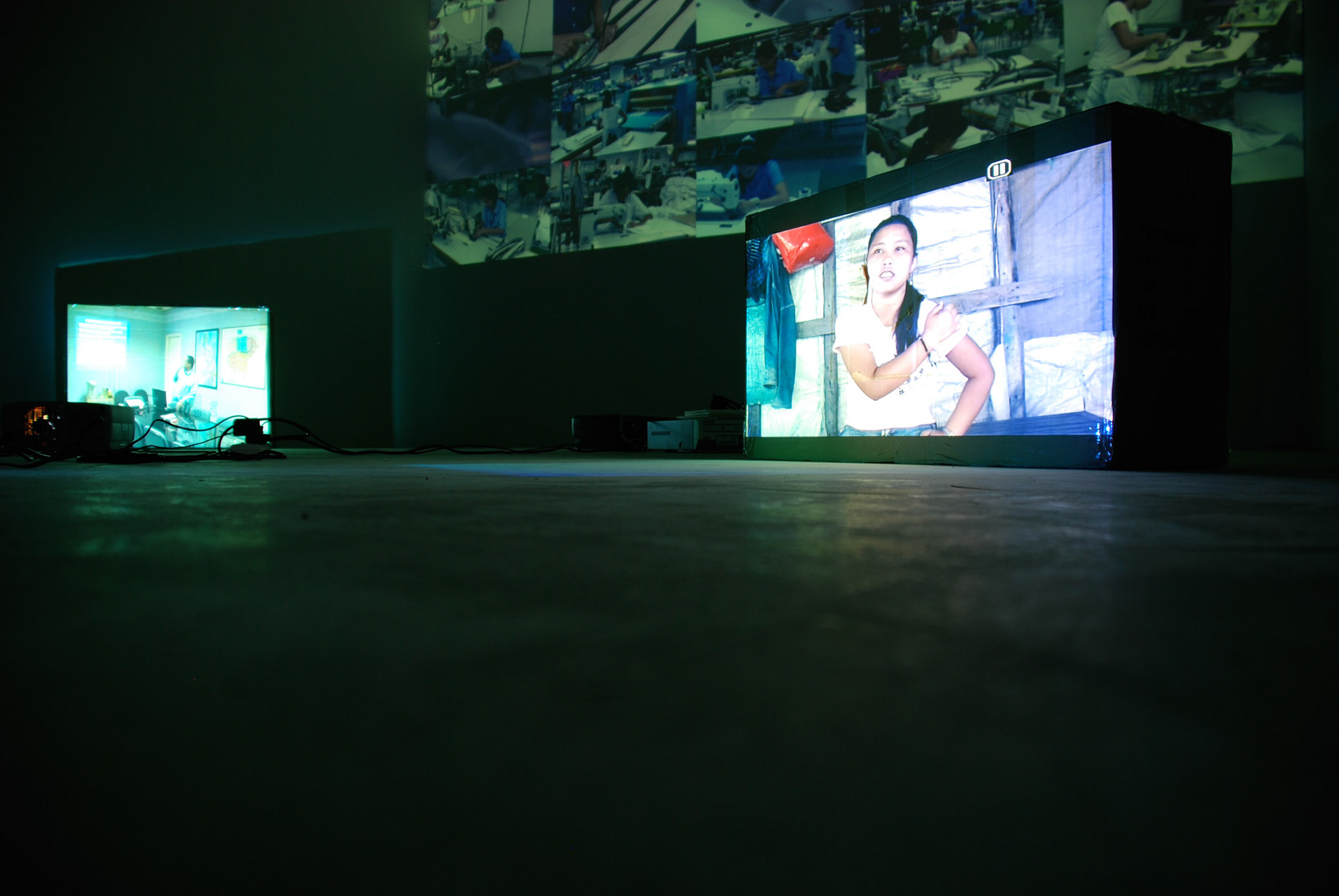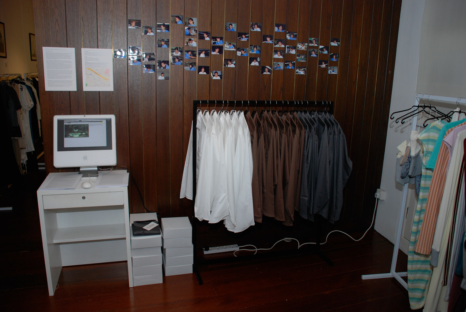 The Invisible of the Visible exhibition was the launch of the myfashionindustries label at the Front Row, fashion boutique in Singapore. I used the Made in the Philippines shirt as a link to the production conditions of the Cavite Economic Zone. Questions of access and locality are set off on different levels throughout the project: The shirt functioned for me as an „entry ticket“ into the free trade zone because unless one is an employee within the restricted zone, one can only access this place as an investor. Here the shirt functions again as an „entry ticket“ to another place in the exhibition. Only buyers of the shirt were exclusively accredited to visit the second part of the exhibition (a multichannel video installation) at the Squash Court studio/project-space of artist Charles Lim. This exclusivity provides a visual proximity to the labour aspect of the shirt. The exhibition addresses the alienation that is problematic, but common in our perception of commodities and it reflects the concept of the shirt in a spatial way.